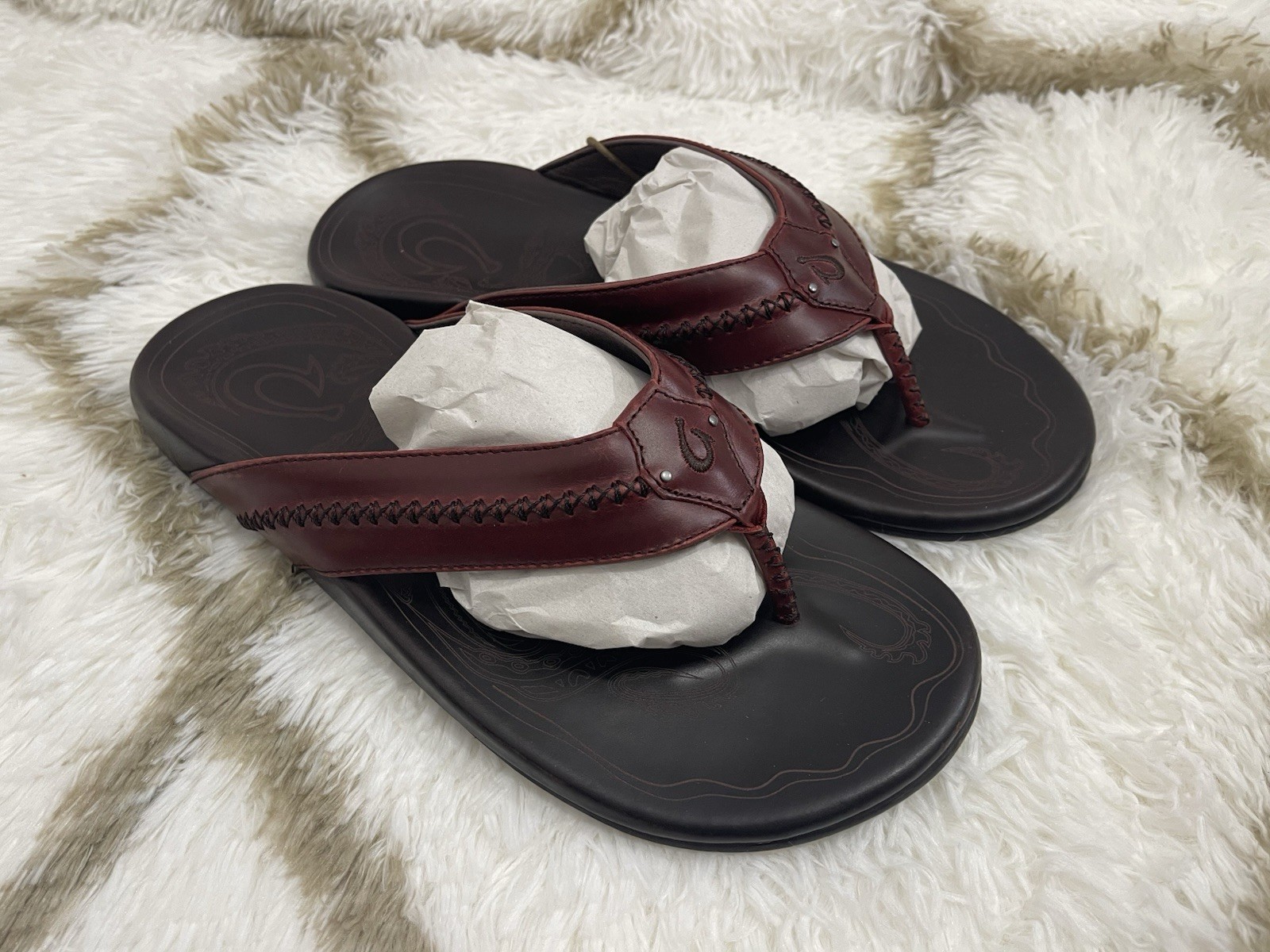 Brand New with box 100% authentic Men's size 11 Color Terra / Dark Wood All sales are final, pleae make sure it's the right size before ordering Fast shipping via UPS Ground OluKai Craftsmanship: Includes octopus-inspired laser-etched artwork on the footbed, canoe lash whipstitching, and an embroidered logo for a distinctive touch. Comfort and Fit: Features rich leather straps, a soft microfiber lining, and a comfortable handsewn toe post for a snug fit. Premium Materials: Crafted with premium full-grain leather for a luxurious and durable finish.