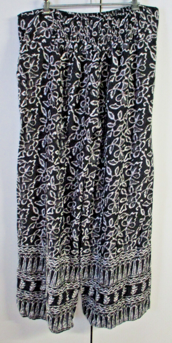 Ladies Pants Details: Om Shanti Pi Ladies long pants with skirt overlay Elastic waist at the back Pull on style pants, very loose and flowing black with white and grey floral print Size 14-16, no sizing on pants 100% rayon Waist measures 46cm across, will stretch Waist to hem 100cm Very good second hand condition Buyer to pay postage where indicated. I will happily combine items. Please contact me prior to bidding if you have any queries.