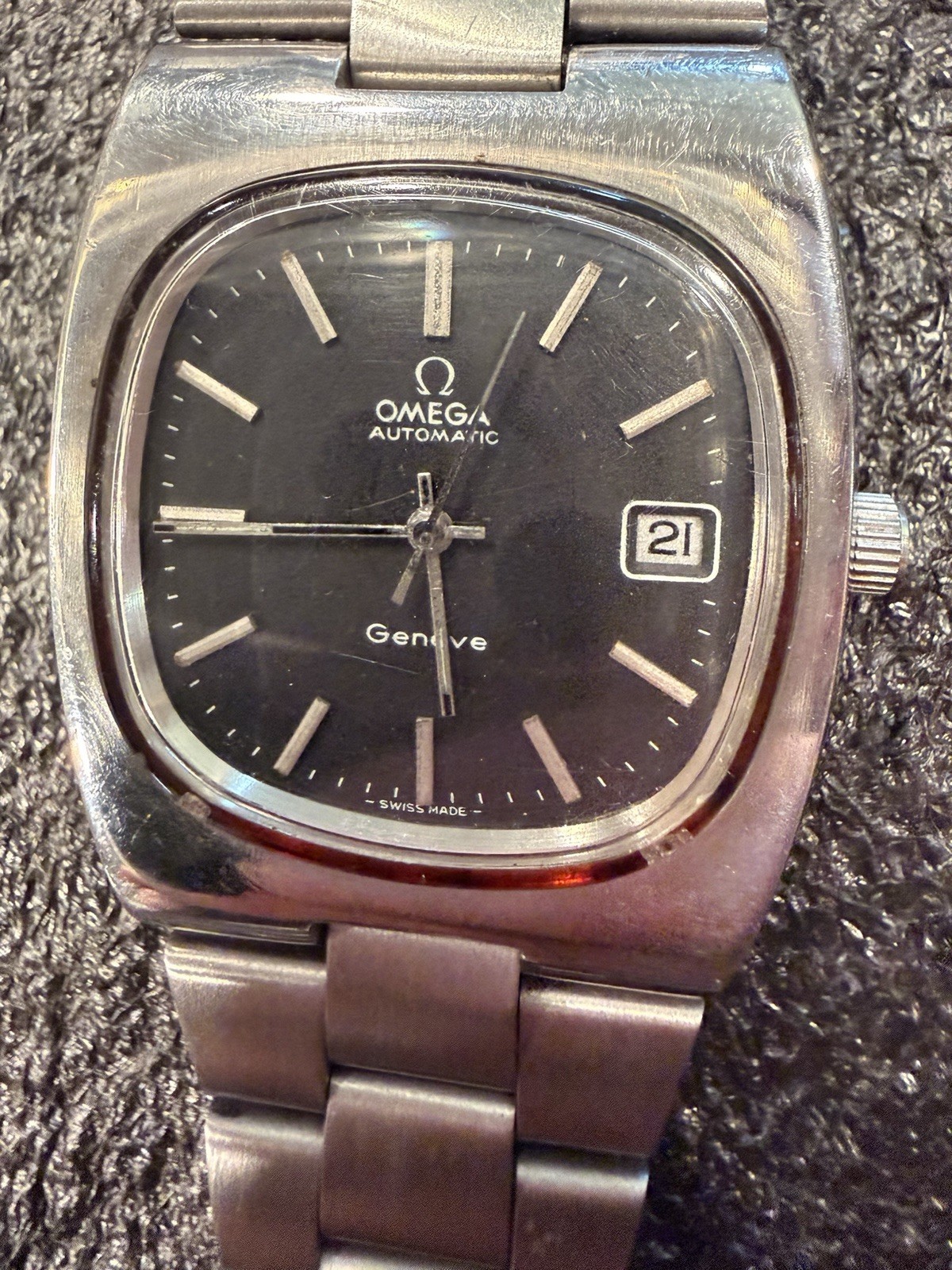 The Omega Geneve Automatic Date 36mm Black Dial 1970's Men's Watch is a vintage timepiece with a classic design featuring a stainless steel case and baton indexes. The watch has a smooth silver bezel and a black dial, giving it a timeless and elegant look. With its mechanical automatic movement and 36mm case size, this Omega watch is perfect for any occasion and is sure to add a touch of sophistication to any outfit. The stainless steel bracelet band adds durability and style to this iconic timepiece. Extra link on band extends fit up to 8 1/4 inch wrist. ( link is already added )