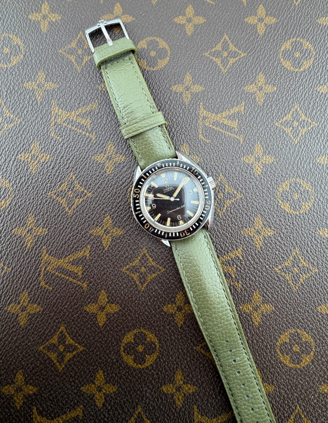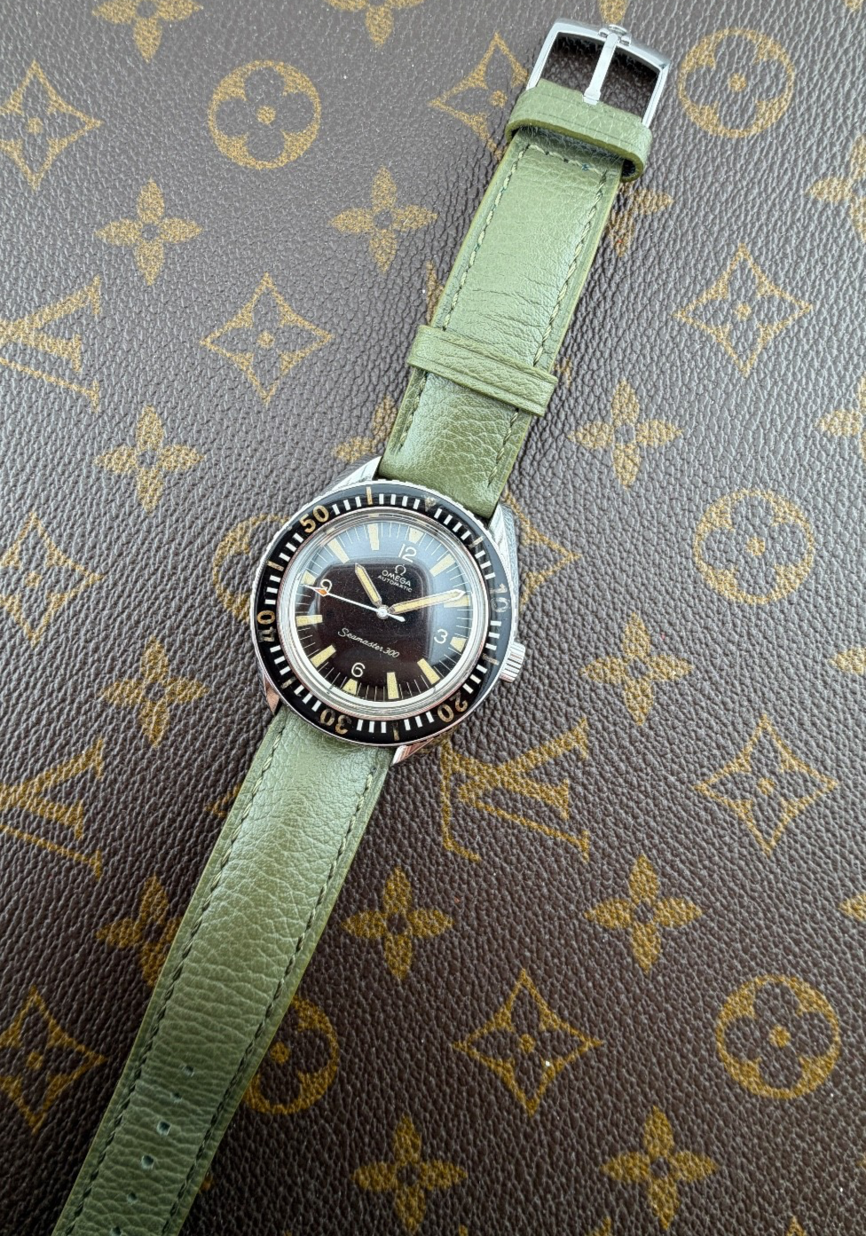PROPONIAMO; -Marca: OMEGA SEAMASTER 300 VINTAGE -Cassa: ACCIAIO INOX DA 401MM ESCLUSA CORONA , FONDELLO ORIGINALE A VITE -Movimento :ORIGINALE CALIBRO 562 -Vetro:PLEXY ORIGINALE CON LOGO OMEGA AL CENTRO -Corona:ORIGINALE -Ghiera:GIREVOLE BIDIREZIONALE ORIGINALE -Tasti: NO -Quadrante: NERO ORIGINALE TRIZIO -Lancette: ORIGINALI TRIZIO -Cinturino/Bracciale: PELLE VERDE MILITARE DA 20MM , FIBBIA OMEGA DA 18MM -Scatola e documenti: NOSTRA POCHETTE IN VELLUTO COMPRESA -Condizioni : OTTIME -Revisionato:SI -Uomo/donna/unisex: UOMO PER QUALSIASI DUBBIO CONTATTATEMI ,RISPONDEREMO IL PRIMA POSSIBILE