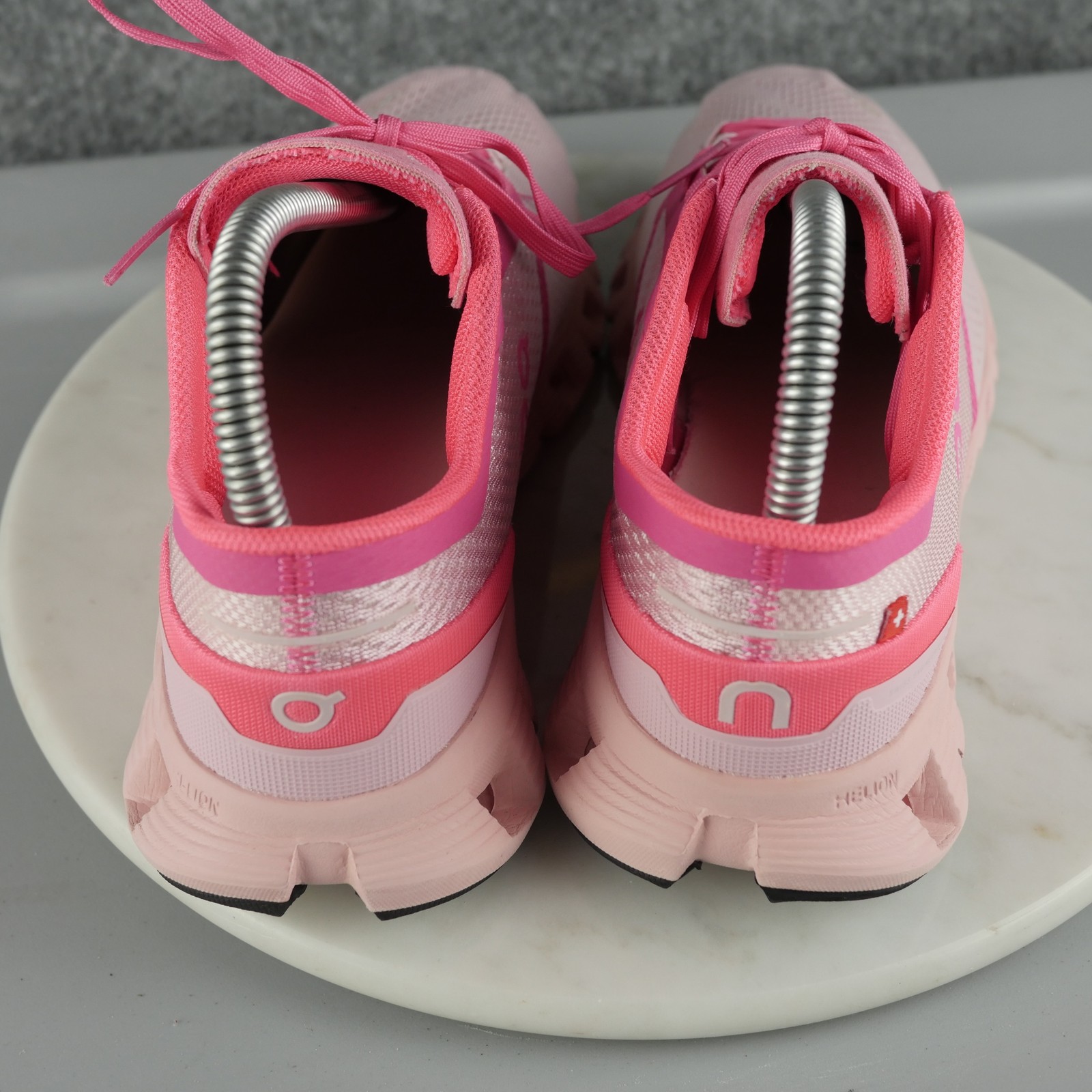 Brand: On Model: Womens Cloud running shoes with CloudTec cushioning, style code 40.99699. Type: Womens low-top athletic sneakers designed for road running, walking, gym sessions, and everyday wear. Size: Womens US 7, UK 5, EU 38 per interior tongue labels. Color: Light pink mesh uppers with darker pink overlays, pink midsoles, and black rubber outsoles. Upper material: Lightweight breathable mesh with synthetic overlays along the midfoot, eyestays, and heel for structure and support. Lining and insole: Soft textile lining with padded collars and tongues plus cushioned insoles for underfoot comfort. Midsole and outsole: CloudTec Helion foam midsole with segmented pods engineered to provide responsive cushioning, paired with durable rubber outsole sections positioned in high-wear zones for traction on paved surfaces. Features: Low-top silhouette, traditional lace-up closure with flat laces, tongue pull loops, and a flexible platform suitable for daily mileage and all-day comfort. Branding: On logos on the side panels, tongue labels, heel counters, and outsoles plus a small red Swiss flag tab at the lateral rear quarters. Interior label details: Tongue tags list womens size US W7, UK 5, EU 38, display Swiss Engineering branding, indicate the shoes were made in Vietnam, and reference style code 40.99699 along with trademark and website information. Original box is not included; any shoe trees, plastic bags, hands, or other photo props shown are for presentation only and are not included with purchase. **Please Read Before Purchasing: • I take detailed photographs and provide product information based on the exact item shown. • You are strongly encouraged to carefully review all images and send any questions before purchase. • I offer free returns if you believe the item is significantly not as described. Thank you for your understanding and for supporting my store. Footwear Notice: Materials such as foam, rubber, and adhesives can naturally age over time; long-term durability cannot be guaranteed, so please review photos carefully.