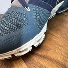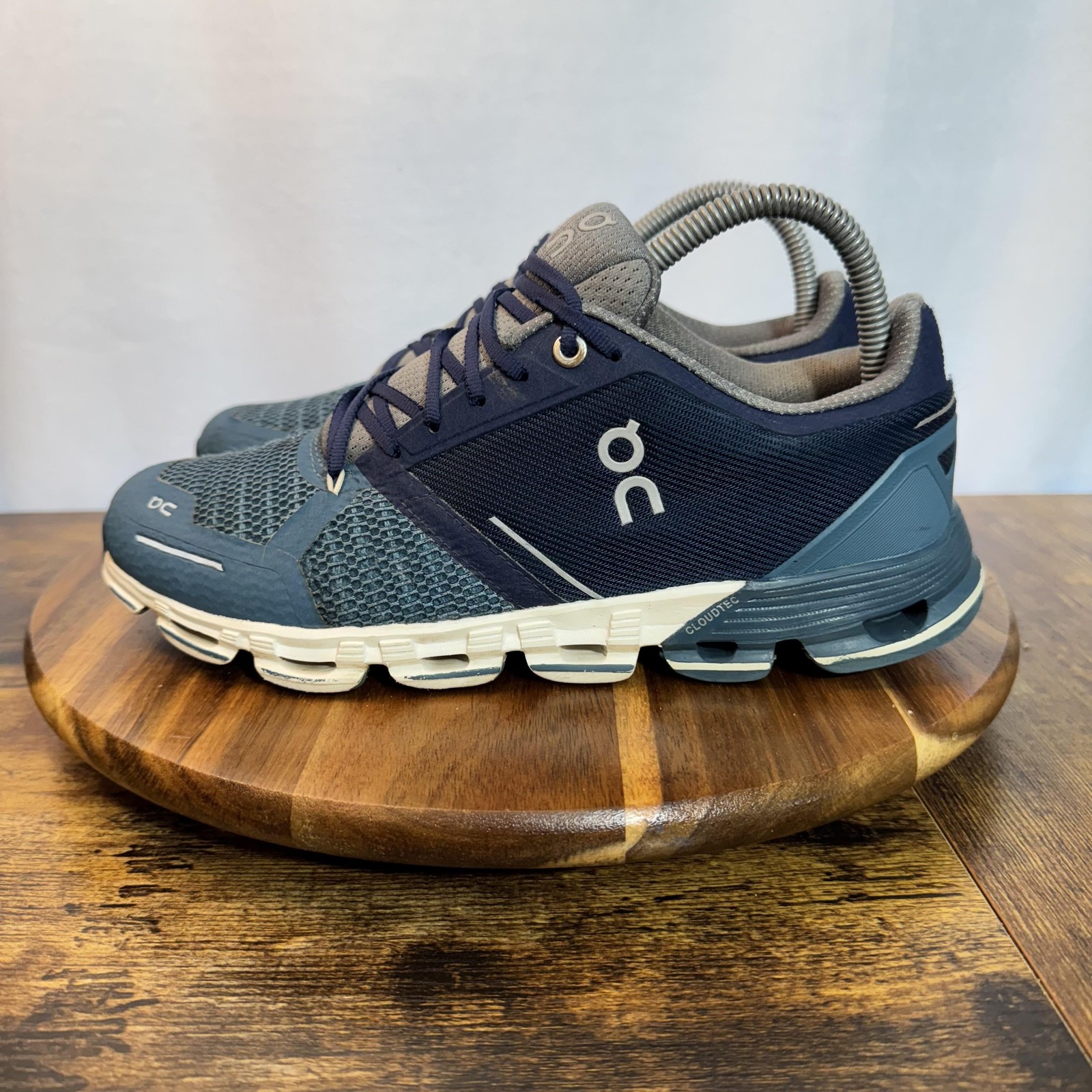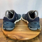 Brand: On Running Style: Cloudflyer road running shoes with Swiss Engineering CloudTec cushioned sole. Color: Navy and slate blue uppers with gray lining and white/blue midsoles. Size: Womens US 8 (per interior size tag). Upper: Breathable mesh with synthetic overlays, padded tongue and collar, traditional lace-up closure. Outsole: Segmented rubber pods with CloudTec cushioning for impact absorption and a flexible, responsive ride. Details: On logo hits on sides, heel, and tongue with reflective accents for visibility. Special notes: Please review all photos for close-ups of wear on toe mesh, midsoles, and soles.