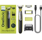 One Blade. philips Norelco 360blade 5length settings Open Box. Item: S1(9) Rechargeable OneBlade 360 Face plus Body can trim, edge, and shave any length of hair. Shave is not too close so your skin stays comfortable. The innovative 360 Blade can flex in all directions to adjust to the curves of your face. The design enables constant skin contact and control. Includes 2 blades, 1 360 blade for your face and 1 blade for your body. Use wet or dry, with or without foam. Click-on skin guard for extra protection on sensitive areas, even below the belt. Includes a 5-in-1 stubble comb plus 1 body comb for an even trim on face or body USB-A charging cable included (wall power adapter not included). Subscribe and Save on Philips Norelco OneBlade 360 replacement blades and save up to 15 percent . Includes: 1 handle, 1 360 blade for face, 1 blade for body, 1 5-in-1 comb for face, 1 skin guard for body, 1 body comb, 1 USB-A charging cord (wall power adapter not included), 1 protective cap. 2023 Men’s Health Award winner for “Best Electric Razor”