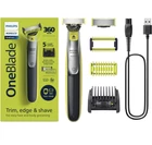 One Blade. philips Norelco 360blade 5length settings Q3(21) Used, tested still in good condition. Rechargeable OneBlade 360 Face plus Body can trim, edge, and shave any length of hair. Shave is not too close so your skin stays comfortable. The innovative 360 Blade can flex in all directions to adjust to the curves of your face. The design enables constant skin contact and control. Includes 2 blades, 1 360 blade for your face and 1 blade for your body. Use wet or dry, with or without foam. Click-on skin guard for extra protection on sensitive areas, even below the belt. Includes a 5-in-1 stubble comb plus 1 body comb for an even trim on face or body USB-A charging cable included (wall power adapter not included). Subscribe and Save on Philips Norelco OneBlade 360 replacement blades and save up to 15 percent . Includes: 1 handle, 1 360 blade for face, 1 blade for body, 1 5-in-1 comb for face, 1 skin guard for body, 1 body comb, 1 USB-A charging cord (wall power adapter not included), 1 protective cap. 2023 Men’s Health Award winner for “Best Electric Razor”