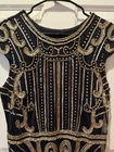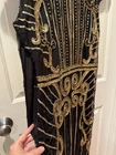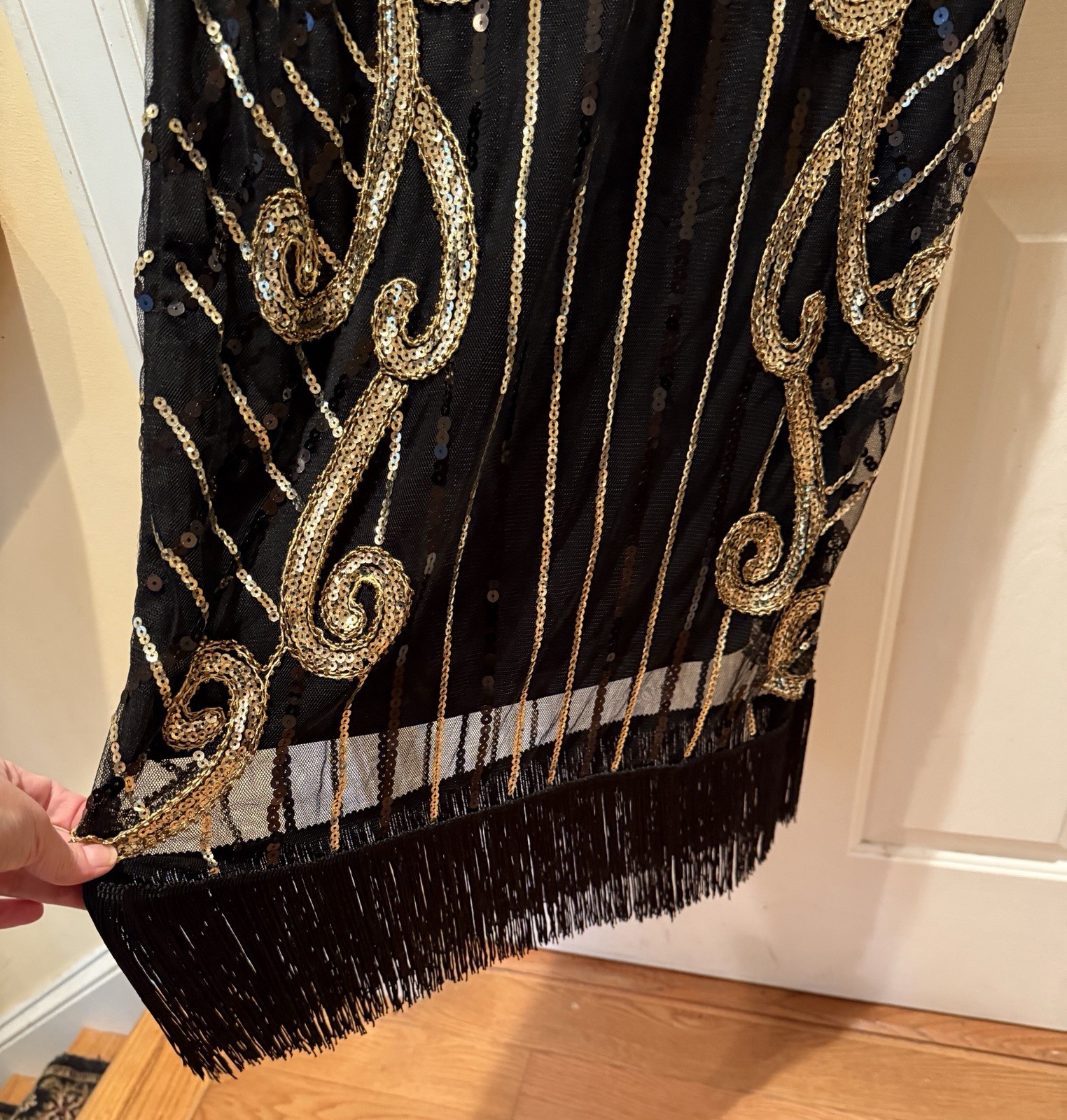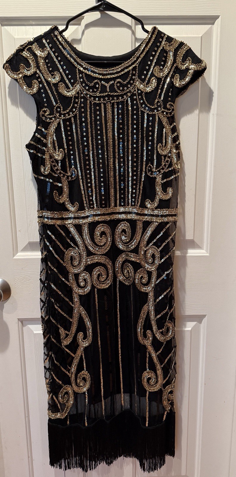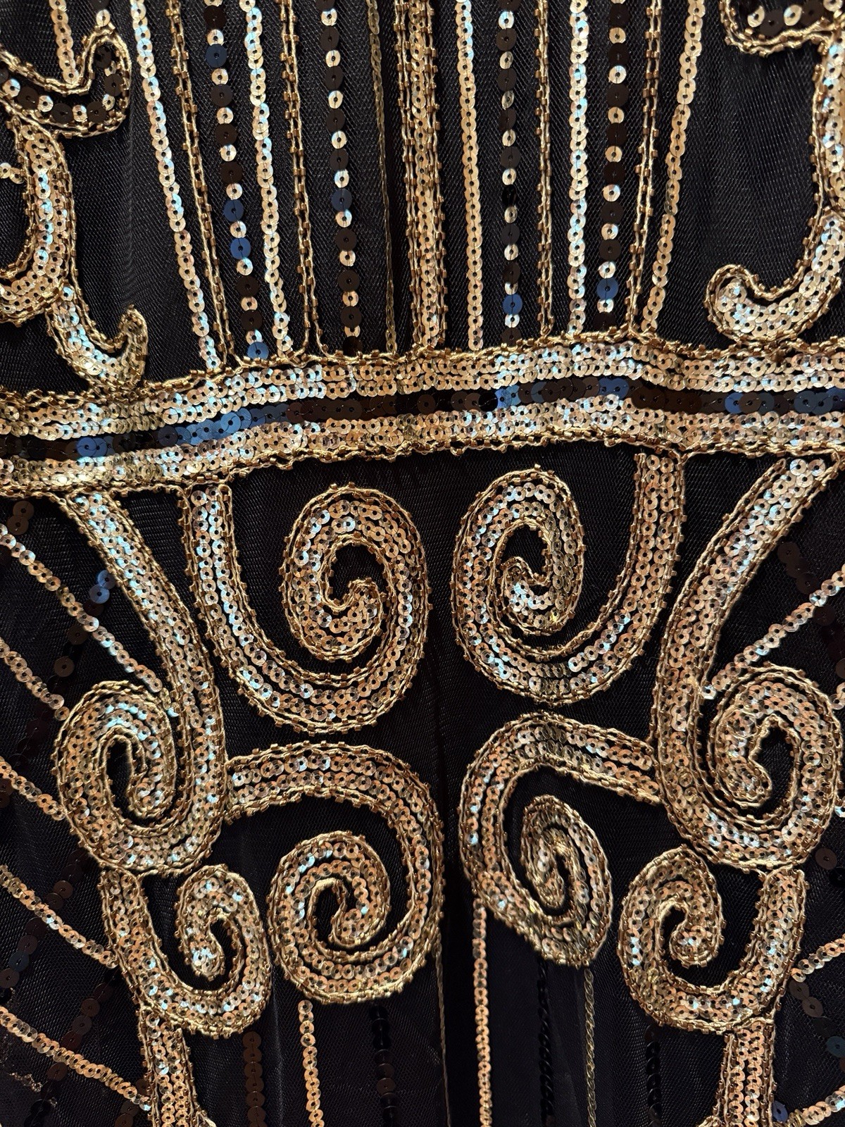 Gorgeous black and gold sequined 1920s style midi dress; great flapper vibes with fringe hem; beautiful sequins adorn the sheer outer layer, fully lined; side zipper and adorable cap sleeves; size large; approximate flat measurements: pit to pit 17 inches Waist 17.5” shoulder to end of tassel hem 48”. #Retro #Glamour #Formal #Vintage #Sequins