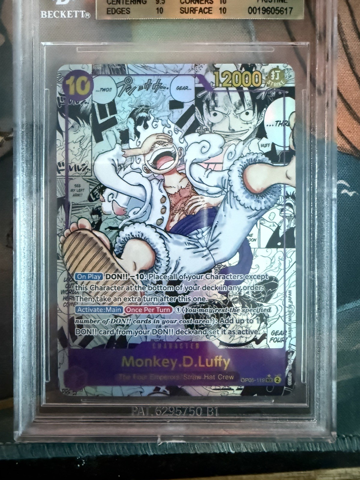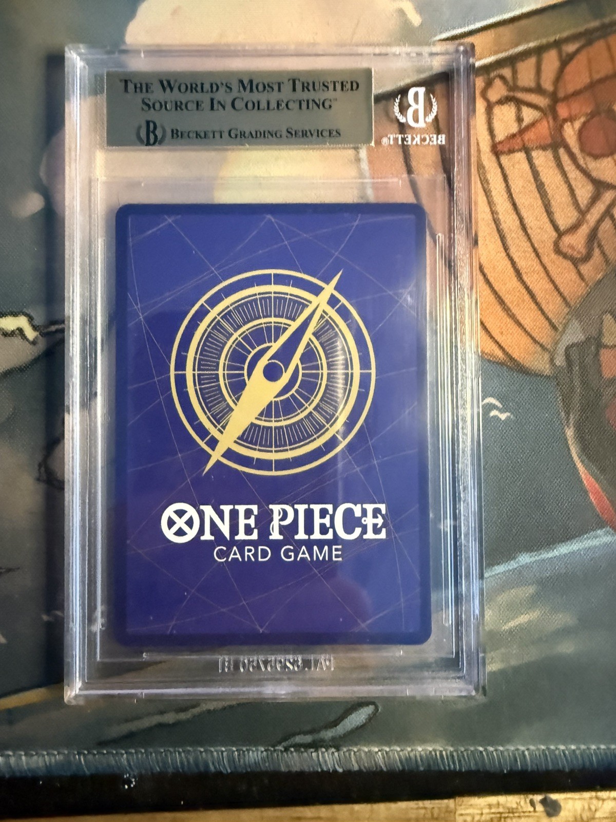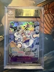 The product is a highly sought-after One Piece card game featuring Monkey D. Luffy from the manga. This SP card from the set "One Piece THE BEST" comes with alternate art and is graded by Beckett Grading Services (BGS) as a pristine 10. Manufactured by Namco and authenticated by Professional Sports Authenticator (PSA), this secret rare card is perfect for collectors looking to add a valuable piece to their collection. The card is in English and features stunning manga art, making it a must-have for any One Piece fan. I truly believe this card should be a Black Label. Just don't have the time to play BGS game, otherwise I would send it back in for a review to get it upgraded.