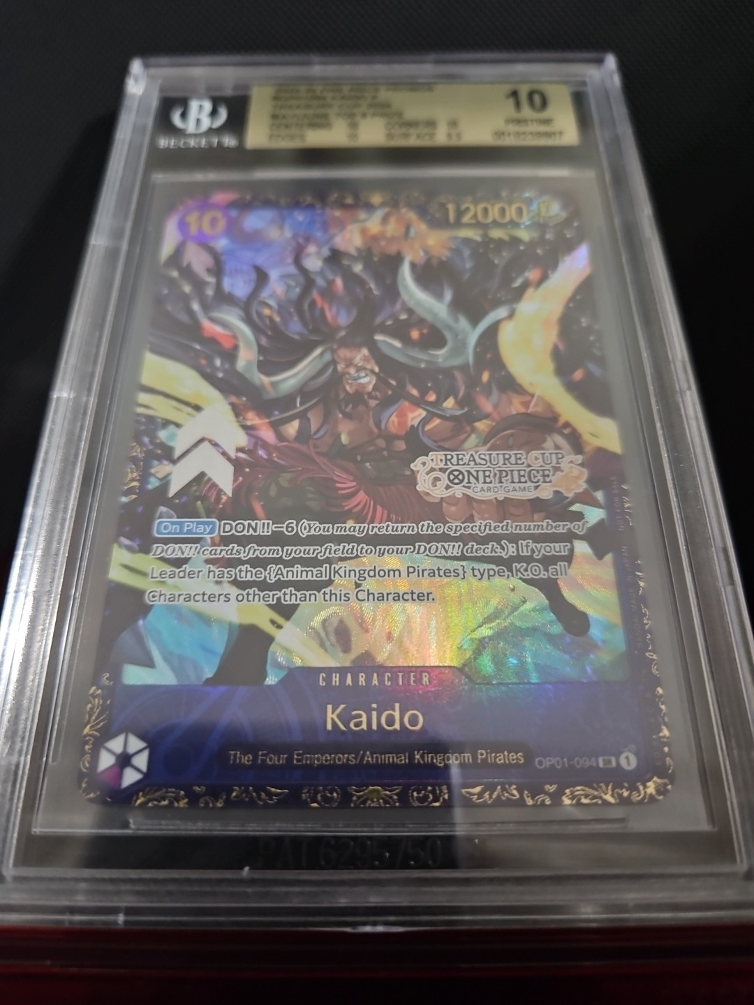 The product is a One Piece Kaido Treasure Cup promo top 8 English graded 10 PSA card. This collectible card is part of the One Piece Promotion Cards set and features the character Kaido with an attack power of 12000. Manufactured by Namco in 2023, the card is illustrated by Kitsuke and graded by Professional Sports Authenticator (PSA). With a foil finish and rarity as a promo card, this item is a valuable addition to any One Piece CCG collection.