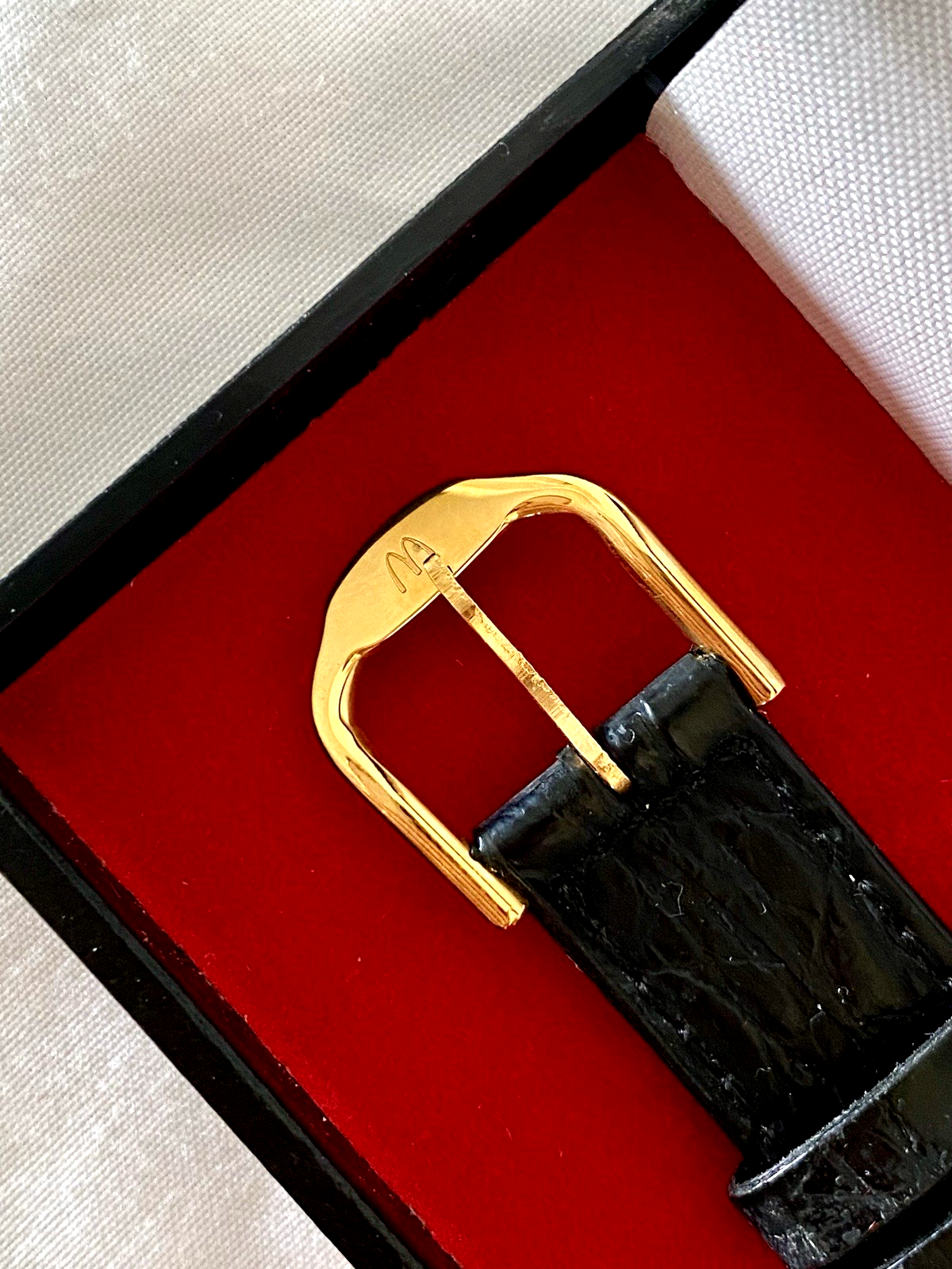Rare Vintage McDonald’s Beijing Executive Watch 1992 – Gold-Tone Corporate Gift, Unworn with Original Box & Papers – McDonald’s Collectible Memorabilia for McDonald’s Fans, Executives & Watch Enthusiasts Own a true one-of-a-kind piece of corporate and pop culture history: an unworn promotional McDonald’s wristwatch from a special Beijing edition — the only one known to the market . This exceptional timepiece was reportedly created as an exclusive executive gift celebrating the launch of the very first McDonald’s in Beijing on April 23, 1992 — at the time, the largest McDonald’s in the world. T his watch captures the moment when Western pop culture met Chinese modernity. It comes in the original presentation box with the certificate insert and protective film still on the crystal — factory fresh and unworn. Why collectors, McDonald’s memorabilia fans, and watch enthusiasts will want this: This is not a mass promo — it’s a unique piece , the launch of the first McDonald's in Beijing was a significant event. Wearing or owning this watch is like holding a golden ticket to that historic moment in global commerce and culture. Initially, the restaurant was a symbol of engagement for the U.S. and a status symbol for those who visited. It was seen by some as representing cosmopolitanism and a window to the world for young Beijingers. It features a sleek 34 mm round case , ultra-slim 6 mm profile , and refined Chinese numeral dial create a sophisticated vintage look, accented by the small golden arches McDonald’s® logo above a stylized Great Wall and “BEIJING” in gold capital letters. Perfect for McDonald’s collectors, vintage promotional memorabilia hunters, corporate gift collectors, or anyone seeking an impossible-to-find conversation piece. Acquired from the son of the original owner — estate/collection provenance. Date / Era: Produced in the early 1990s era (correlates with McDonald’s Beijing launch period) Key Features and further details Type: Vintage promotional wristwatch — McDonald’s “Beijing / Great Wall” edition Condition: New Old Stock (NIB) — protective film still on crystal; strap unworn Dial: Red outer ring with gold Chinese numerals (一–十二), stylized Great Wall graphic and McDonald’s Golden Arches in gold, two-tone center (matte gold / black yin-yang division) Hands: Gold-tone dauphine hour & minute hands; slim gold second hand Case Material/Finish : Gold-tone metal case (polished finish) Crown: Gold-tone fluted crown (factory condition) Crystal: Flat acrylic/mineral crystal — still has factory protective film Case Back: Stainless steel back stamped “Performance Designs / Made in Hong Kong / Japan Movt / Stainless Steel Back” (factory protective film present) Strap: Black textured leather with gold-tone buckle engraved with small golden arches McDonald's® logo and an elegant Beijing writing on the back of the strap— unworn Packaging: Original rectangular black presentation box with gold lettering “McDonald’s Beijing (M. 北京麦当劳 Beijing)”, red velvet-style insert included Extras: Certificate / informational insert included describing the Great Wall and the watch’s cultural significance Provenance: Acquired from the son of the original owner — estate/collection provenance Date / Era: Produced as a special promotional/executive piece in the early 1990s era (correlates with McDonald’s Beijing launch period). Specifications: Case size: 34 mm Case thickness: 6 mm Lug-to-lug: 37 mm Strap length: Buckle side 75 mm / Long side 105 mm Case shape: Round Dial: Chinese numerals Movement: Analogue Tone: Gold-tone finish Why Buy This Now Unique, impossible-to-find items like this rarely reappear. Whether you collect McDonald’s memorabilia, corporate promo items, or unusual vintage watches, this executive “Beijing / Great Wall” watch is a rare chance to own an authentic slice of brand history — complete with box and certificate. Add it to your collection today. Collector Notes & Rarity: This watch appears to be a singular promotional gift — not commercially released — making it an ultra-rare piece of McDonald’s memorabilia and corporate gift ephemera. It has never been listed publicly on major auction sites and is likely the only available example on the market. For lovers of fast-food collectibles, brand history, or novelty watches, this is a museum-quality conversation starter. Condition & Handling: Mint, unworn condition with original protective films intact. Photos show the exact item you will receive — please zoom for detail. Professionally packaged for secure insured shipping worldwide. Shipping & Returns Ships from Nevada, USA (insured, tracked shipping). Local pickup welcome — message to arrange. Returns not accepted. Please message with any questions before purchasing. Shipping within 1-2 days. Please contact if you have a question! 🗽LV Antiques: Vintage & Liquidation Emporium🗽 Your trusted source for curated antiques, vintage finds & liquidation deals. Bringing historical charm and modern convenience together - one treasure at a time.