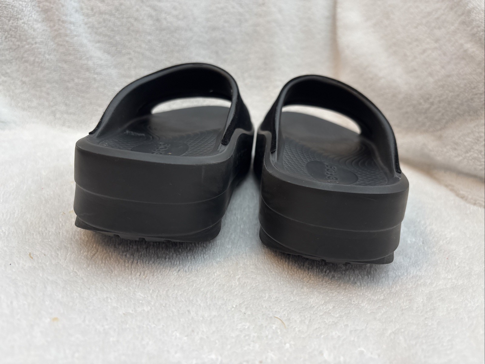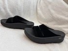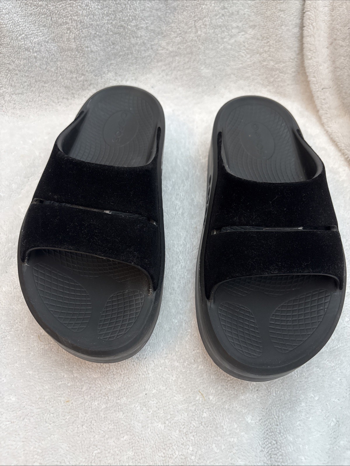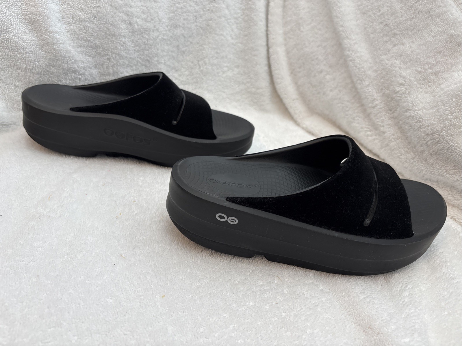 Worn once! The Oofos Ooahh Sport Sandals in Velvet Black are a comfortable and stylish option for women looking for both recovery and performance in their footwear. With a slip-on closure and flat heel design, these slides are perfect for sports enthusiasts who need support and cushioning. The velvet upper material adds a luxurious touch to these practical and functional sandals, making them a versatile choice for active women. With the signature comfort and support of the Oofos brand, these sandals are sure to be a favorite for anyone looking for reliable and high-quality footwear.