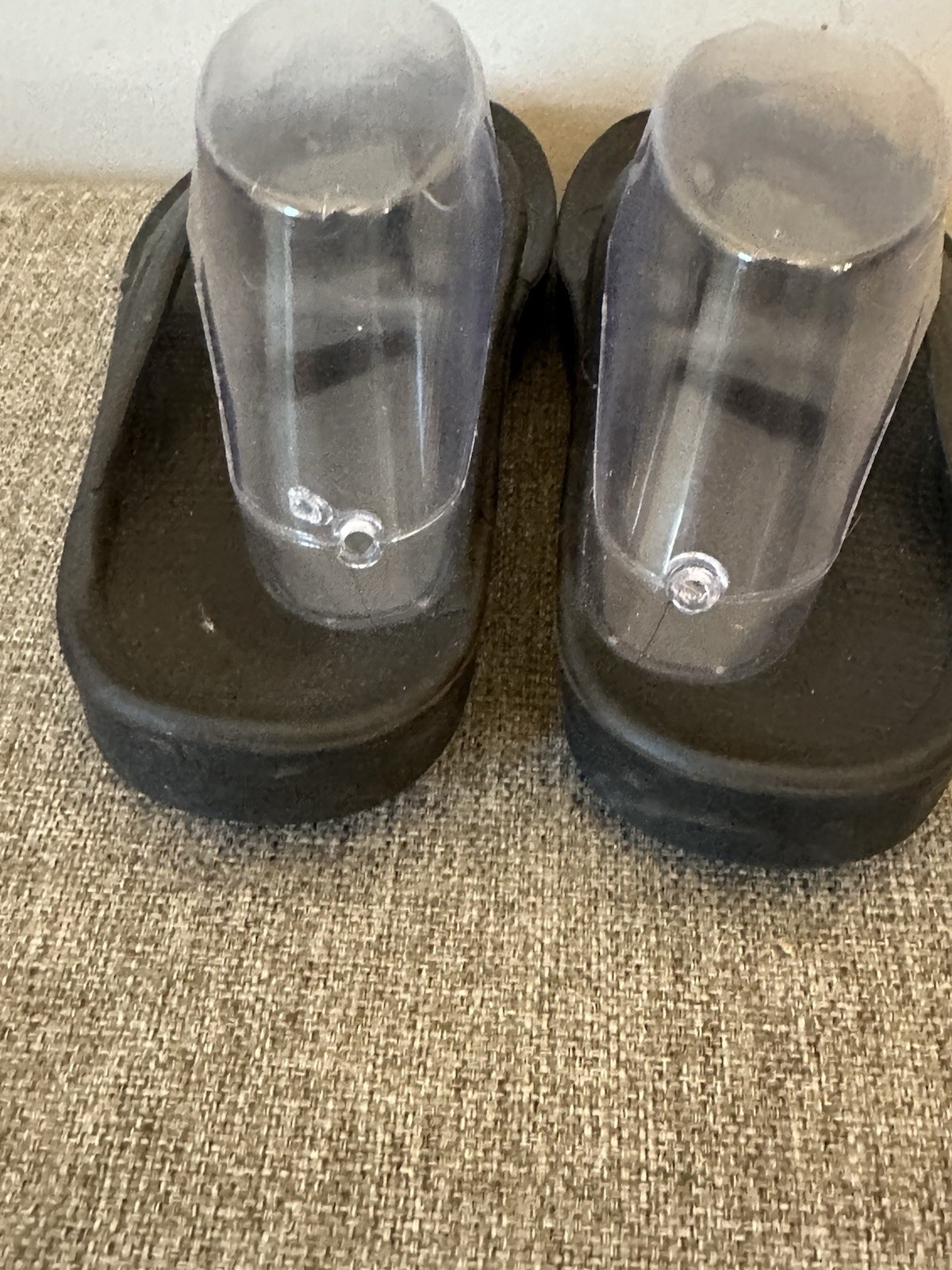 The Oofos Women’s Black Thong Recovery Sandal in size 7 is a comfortable and lightweight slip-on sandal with a low wedge heel. It features a solid black color with logo accents and a cushioned rubber upper material for added comfort. Designed for women, this thong-style sandal is perfect for those looking for a stylish and supportive footwear option for everyday wear or post-recovery. The standard shoe width and cushioned design make it a versatile choice for various activities. Preowned Good Condition