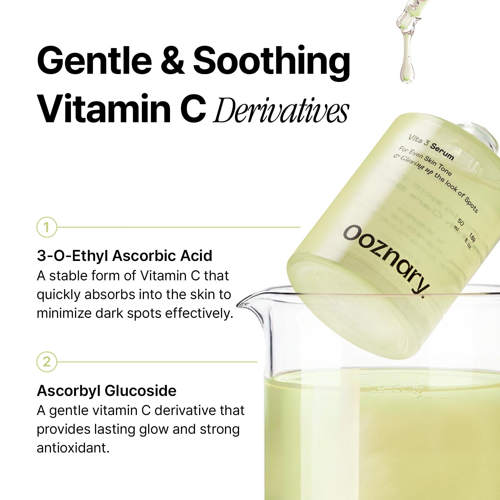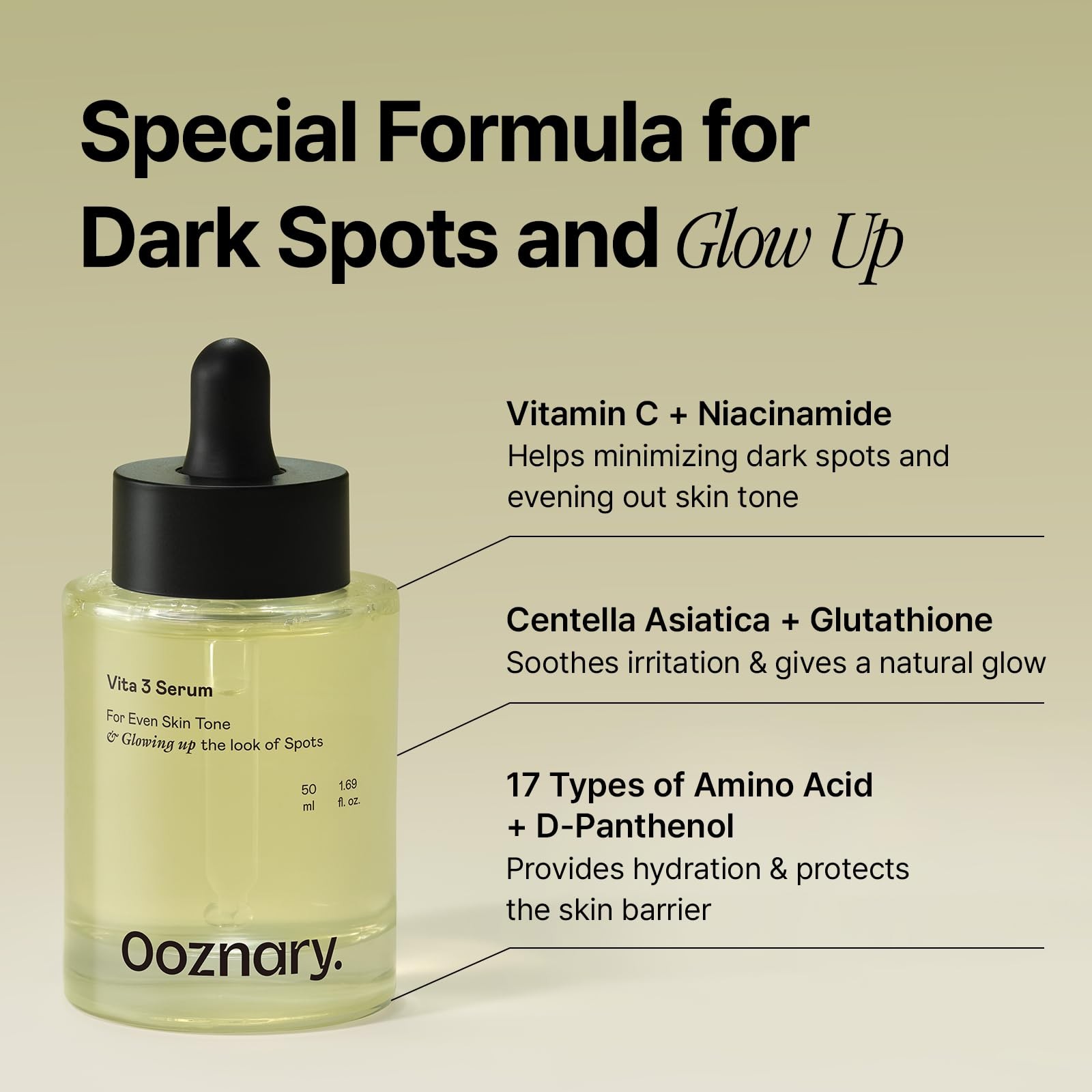 Elevate Your Skincare with Vita 3 Serum Formulated with three powerhouse vitamins—Niacinamide (Vitamin B3), Vitamin C, and Glutathione—our Vita 3 Serum provides a holistic approach to revitalized skin: Helps to visibly refine and smooth the appearance of skin texture and tone Boosts your skin’s natural radiance, giving a fresh, healthy-looking glow Deeply hydrates and softens, enhancing skin’s elasticity for a naturally supple feel [GENTLE VITAMIN C FOR SENSITIVE SKIN] Formulated with a stable, non-irritating form of Vitamin C derivatives, this serum helps to improve uneven skin tone, and bring a natural, healthy glow to your skin without the sting and irritation [FAST ABSORBING VITAMIN C] Combined with Niacinamide, it not only helps speed up the absorption of Vitamin C but also works to regulate excess sebum production. Achieve a lightweight and fresh finish with no stickiness or heavy residue. [SOOTHING IRRITATED SKIN] Formulated with Centella Asiatica Extract (Madecassoside) and Glutathione, this serum soothes irritated, sensitive skin and helps bring back your glow. [GENTLE EXFOLIATION & DEEP HYDRATION] 17 amino acids gently exfoliate dead skin cells, while D-Panthenol restores moisture and strengthens the skin barrier for a smooth, hydrated finish. [WHY CHOOSE OOZNARY?] We are always dedicated to provide clean beauty products that prioritize skin health, using gentle yet effective ingredients to deliver visible results without irritation.