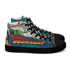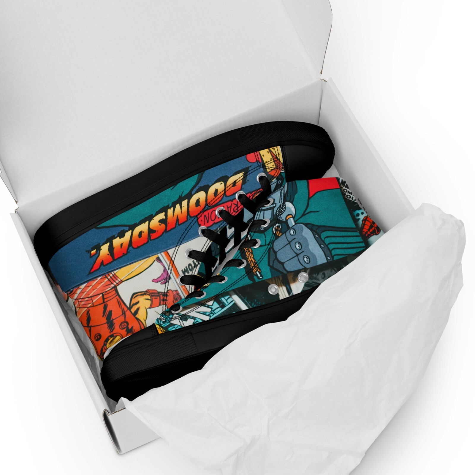 The "Oparetion Doomsday High Top Canvas Sneakers" by UVelsi are bold comic design shoes for men. These limited edition sneakers feature a lace-up closure, cushioned insole, lightweight construction, and adjustable fit. They are handmade with a durable rubber outsole, suitable for various activities such as basketball, running, and hiking. The shoes are designed with a retro, modern, and colorful theme, perfect for a statement look. Step up your shoe game with the High Top Canvas Shoes. These handmade, trendy shoes are sure to spice up your outfit. Get yours now! • 100% polyester, canvas upper side • Ethylene-vinyl acetate (EVA) rubber outsole • Breathable lining, soft insole • Faux leather toe cap • Padded collar, lace-up front • Soles and laces in matching colors Size guide preview (Imperial) US Men UK Europe Foot Length Japan Outsole Length 5 5 4 37.5 9 ⅛ 23 10 ¼ 6 6 5 38.5 9 ½ 24 10 ⅝ 7 7 6 40 9 ¾ 25 10 ¾ 8 8 7 41 10 ⅛ 26 11 ⅛ 9 9 8 42.5 10 ½ 27 11 ⅝ 10 10 9 44 10 ¾ 28 12.00 11 11 10 45 11 ¼ 29 12 ⅛ 12 12 11 46.5 11 ¾ 30 12 ¾ 13 13 12 47.5 12 31 12 ¾ 5.5 5.5 4.5 38 9 ¼ 23.5 10 ¼ 6.5 6.5 5.5 39 9 ⅝ 24.5 10 ⅝ 7.5 7.5 6.5 40.5 10.00 25.5 11 ⅛ 8.5 8.5 7.5 42 10 ¼ 26.5 11 ⅜ 9.5 9.5 8.5 43 10 ⅝ 27.5 11 ⅝ 10.5 10.5 9.5 44.5 11.00 28.5 12 ⅛ 11.5 11.5 10.5 46 11 ½ 29.5 12 ½ 12.5 12.5 11.5 47 11 ⅞ 30.5 12 ¾ Size guide preview (Metric) US Men UK Europe Foot Length Japan Outsole Length 5 5 4 37.5 23.2 23 26.2 6 6 5 38.5 24.1 24 27 7 7 6 40 24.8 25 27.3 8 8 7 41 25.7 26 28.3 9 9 8 42.5 26.7 27 29.5 10 10 9 44 27.3 28 30.5 11 11 10 45 28.6 29 30.8 12 12 11 46.5 29.9 30 32.4 13 13 12 47.5 30.6 31 32.4 5.5 5.5 4.5 38 23.5 23.5 26.2 6.5 6.5 5.5 39 24.5 24.5 27 7.5 7.5 6.5 40.5 25.4 25.5 28.3 8.5 8.5 7.5 42 26 26.5 29 9.5 9.5 8.5 43 27 27.5 29.5 10.5 10.5 9.5 44.5 28 28.5 30.8 11.5 11.5 10.5 46 29.2 29.5 31.8 12.5 12.5 11.5 47 30.2 30.5 32.4