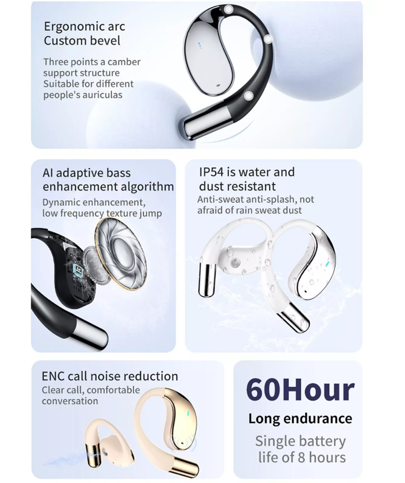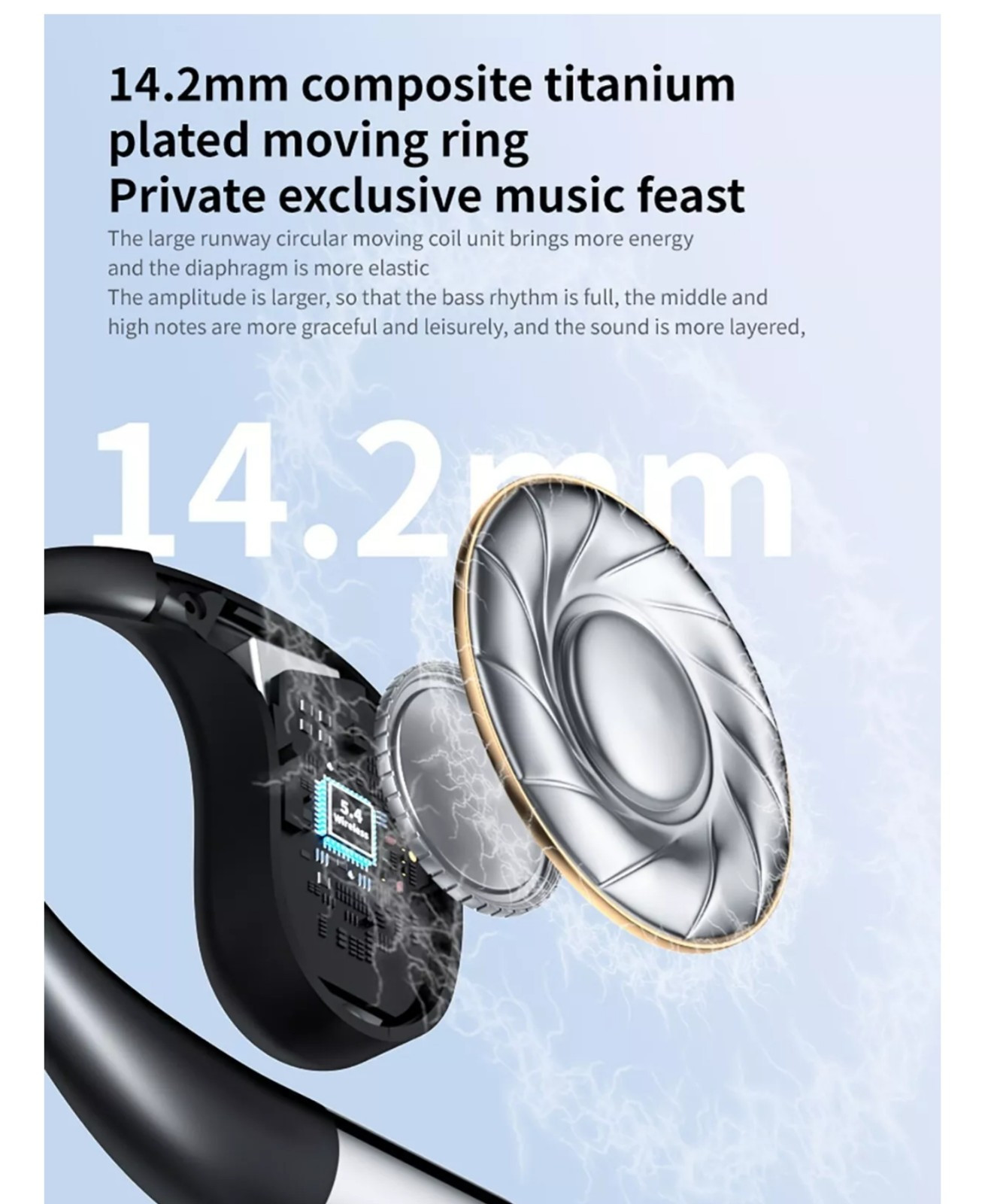 These are black Open Ear Headphones with Bluetooth technology, suitable for working, music, and running. They feature a wireless design, water-resistance, volume control, HD voice, and a built-in microphone. The headphones have a detachable cable, rechargeable battery, touch control, and a built-in on/off switch. They come with a 3-month manufacturer warranty and allow for personalization.