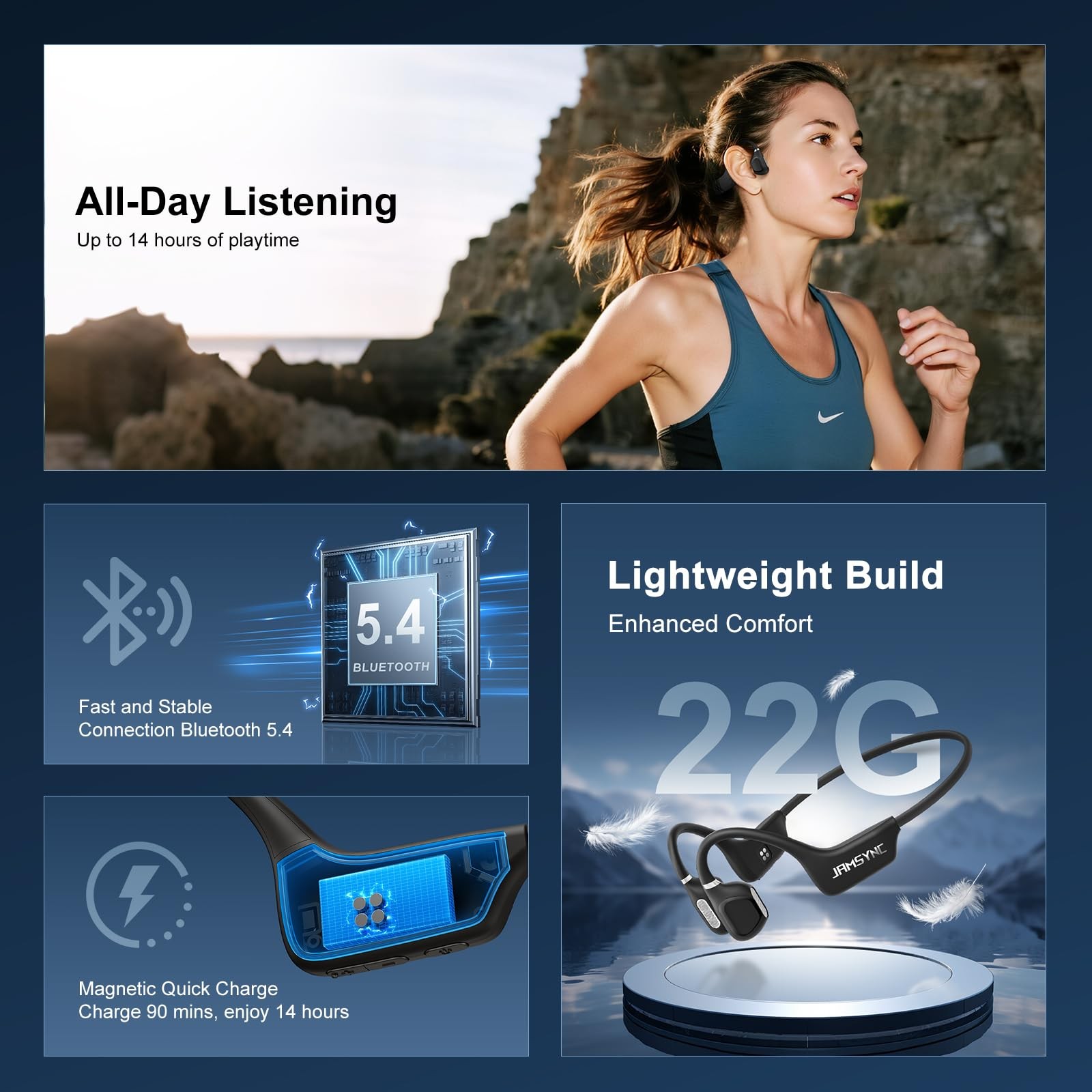 Open Ear Headphones, Running Headphones Bluetooth 5.4 with Built-in Mic, Bone Conduction Headphones 14H Battery & IPX5 Waterproof, Sports Headphone for Running, Cycling, Walking Open-Ear Design for Ultimate Comfort: Experience the freedom of open-ear listening with these innovative sport headphones.Unlike traditional in-ear models,they eliminate discomfort and pressure, allowing your ears to breathe naturally. Even during intense or extended wear, your ears stay cool and dry.Perfect for running, cycling, or any active lifestyle, these headphones let you enjoy your music while staying aware of your surroundings—whether it’s passing vehicles, conversations, or ambient sounds.Stay safe and connected without sacrificing comfort or awareness. Feather-Light and All-Day Wearable: Designed with an ultra-lightweight build and a soft silicone frame, these bone conduction headphones deliver exceptional comfort for all-day use.The flexible, ergonomic shape ensures a gentle and secure fit, avoiding any pressure points associated with conventional headphones. Whether you're at the gym, skating, or on the move, they stay firmly in place while providing a stable and pressure-free listening experience. High-Definition Audio with Immersive Sound: Equipped with advanced 15mm dynamic speakers and a precision-tuned acoustic chamber, these open-ear headphones produce rich, full-range sound with deep bass and crystal-clear highs. The high-performance neodymium magnet drivers ensure every musical detail stands out—whether you’re working out or relaxing outdoors. Enjoy a natural, open soundstage that enhances every moment without isolating you from the world. Extended Battery Life for Non-Stop Playback: Powered by an efficient low-consumption chip and a high-capacity battery, these Bluetooth headphones offer up to 14 hours of continuous playtime—significantly surpassing the average 8-hour runtime of most competitors. Ideal for long workdays, extended workouts,or daily commutes, they reduce the need for frequent charging and deliver reliable all-day performance. Seamless Connectivity with Bluetooth 5.4: Featuring the latest Bluetooth 5.4 technology, these headphones ensure faster pairing, stronger signal stability, and lower latency. With multi-point connectivity, easily switch between two devices—such as your smartphone and laptop—for uninterrupted music streaming or calls. Designed for an on-the-go lifestyle, these bone conduction headphones combine cutting-edge performance with everyday convenience.