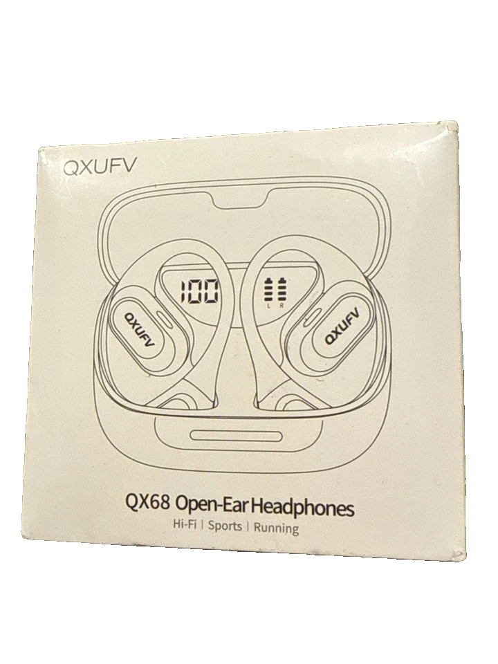 Open Ear Headphones, Wireless Earbuds 40H Playtime Air Conduction Headphones The QXUFV qx68 wireless earbuds offer a sleek and convenient way to enjoy your music with up to 40 hours of playtime. These air conduction headphones in black feature Bluetooth connectivity for easy pairing with your devices. With a focus on comfort and functionality, these earbuds provide a unique listening experience that is sure to impress. **This is an open box item. It's In Excellent Condition. Shows no signs of prior use and appears to be like new
