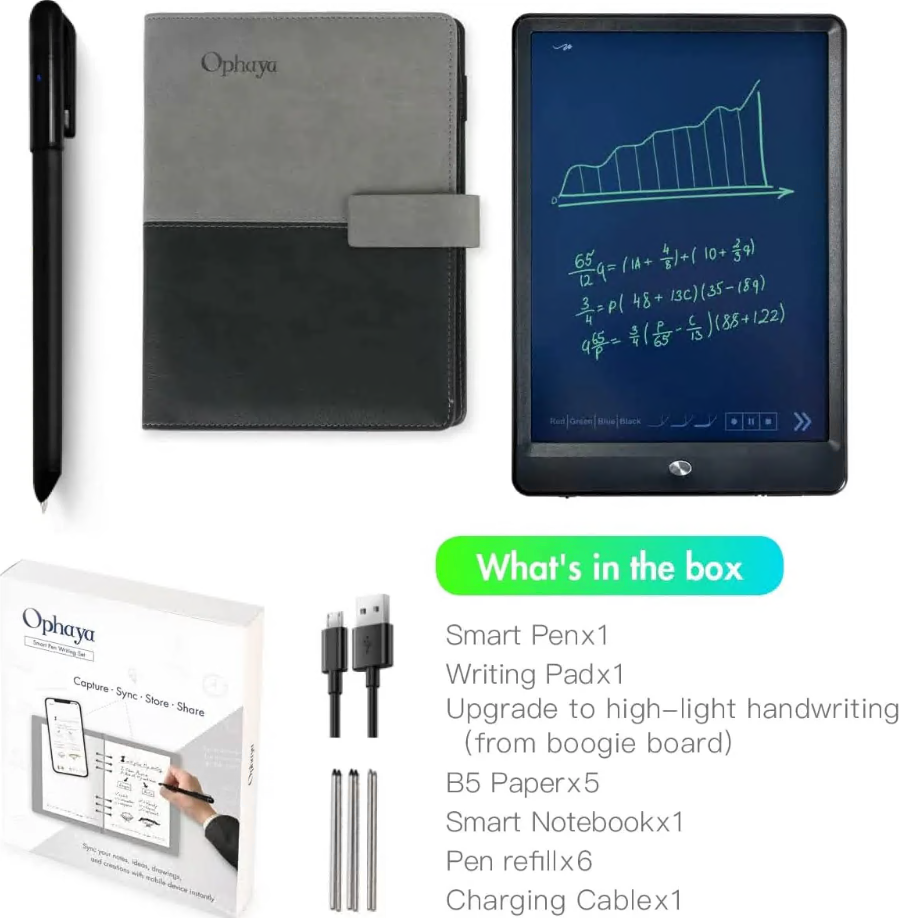 Product Details: Sync your writings and drawings on the Paper/tablet to your device with Ophaya Pro+ APP in a real time OCR Handwriting Recognition: Transcribe your notes into text instantly in 27+ languages Record everything you hear, say, and write, while linking your audio recordings to your notes. Easily notate, edit, organize, and search your notes. Organize notes by modification or creation time for quick retrieval Offers both online and offline modes, allowing you to continue writing and saving your content even when not connected to your phone. Once reconnected, the saved content automatically uploads to the APP Item Includes: Smart Pen X1 Ophaya Pro+ software for iOS and Android (free download) Writing Tablet (Unlimited Usage) X1 Ophaya Notebook (120 pages) B5 Paper X5 Pen Ink Refill X6 Charging Cable X1 User Manual X1
