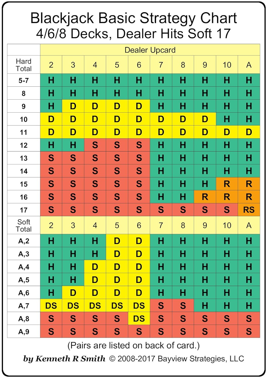 Blackjack Strategy Card - Large Edition: 4/6/8 Decks, Dealer Hits Soft 17 Cards – September 17, 2017 Product Details Publisher : Bayview Strategies LLC (September 17, 2017) Language : English Cards : 2 pages ISBN-13 : 978-0999371954 Item Weight : 0.387 ounces Durable large format blackjack strategy card, made of solid plastic, with the optimal strategy for blackjack games with 4 or more decks, where the dealer hits soft 17. These large-format cards are pocket size: 2.91" X 4.13". The cards are easy to use, but if you need more information, complete instructions can be found at. Read more