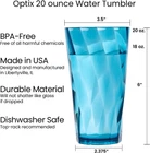Optix Plastic Reusable Drinking Glasses Set of 8 20oz Water Cups in Jewel Tone Colors | BPA-Free Tumblers, | Top-Rack Dishwasher Safe Elevate your drinkware collection with our American-made 8-piece set that includes eight 20 ounce glasses. Made from high-quality plastic material that's free of harmful chemicals, our cups provide a reliable option for you and your party guests. These cups feature 8 brilliant rainbow colors, a stylish twist pattern, a smooth top edge for easy sipping, and a thick base that provides a glass-like appearance, making them both comfortable and stylish. This design will add an updated look to your kitchen aesthetic. Think outside the house- This Optix plastic glass set is a great addition to any college dorm room, first apartment, rv, and camper. Consider adding these as a wedding registry gift for a new household. Stock your home bar for cocktail hour or prepare for morning breakfast, brunch, and dinner with this selection of highball tumblers. Entertain outdoors on the patio, pool, or hot tub with these durable and shatterproof pieces. The 20 fl. oz. cups (" diameter x 6" tall) are versatile and suitable for any drinkware need. Elevate Your Drinkware Experience Enjoy the convenience and durability of our American-made plastic tumblers, perfect for everyday use or special occasions. Shatterproof and dishwasher-safe, these versatile glasses are a must-have for any home.