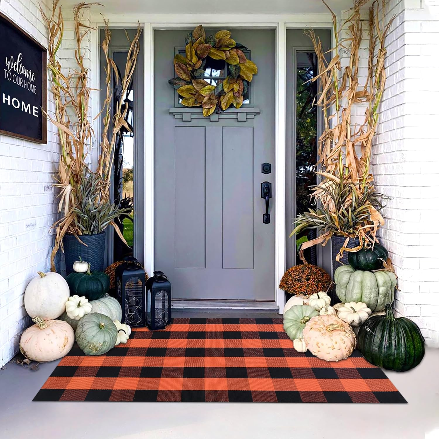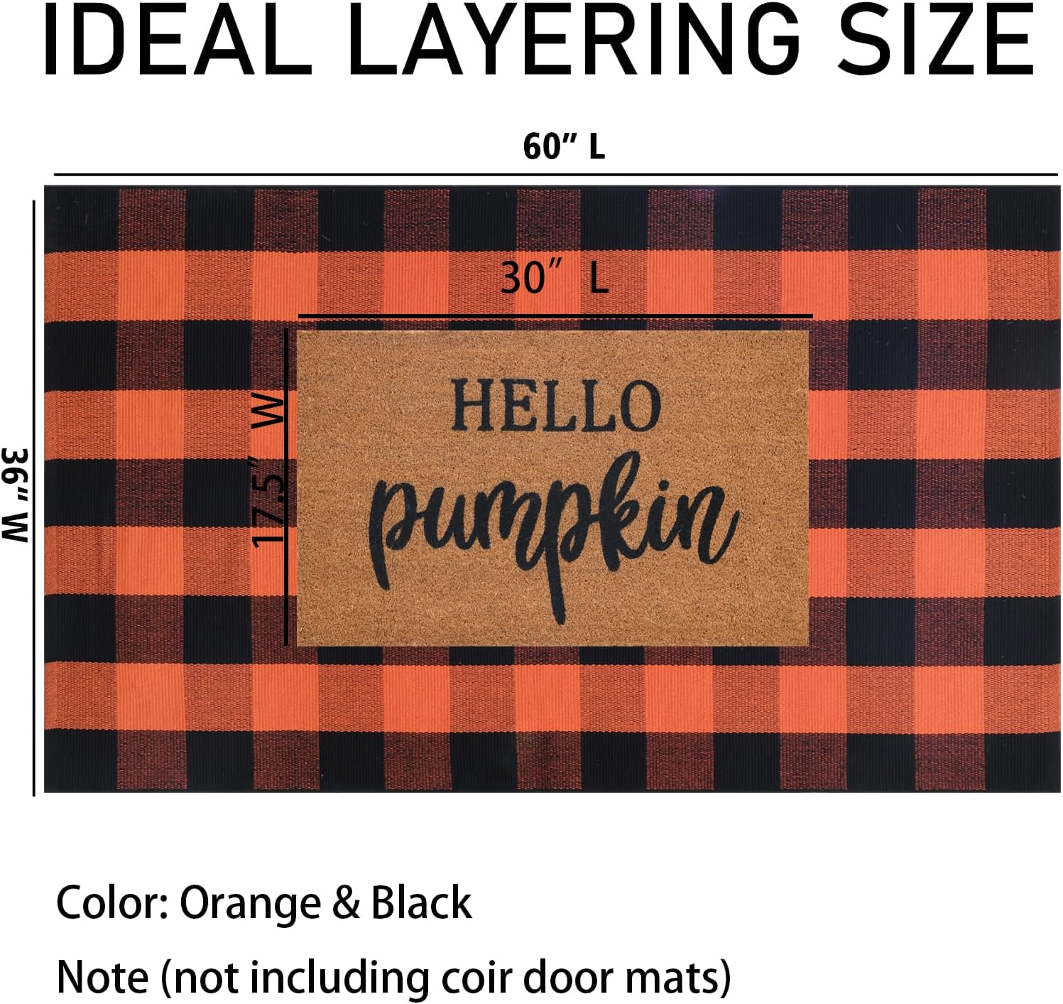 Thanks to its ideal size of 3' x 5', the orange and black plaid rug complement the welcome mat perfectly, creating a double door mat; perfect for welcoming the autumn season and even adding a touch of Halloween charm Crafted from woven cotton, the orange and black plaid rug combines style with durability and strength; It is designed to withstand outdoor elements, foyers, and high-traffic areas, ensuring long-lasting use and enjoyment This plaid rug doormat is designed for convenience and easy maintenance; Simply vacuum or shake the rug to keep it clean; It is also machine washable and can be air-dried without the need for bleaching or drying Featuring a classic color combination of orange and black, this rug is an ideal choice for autumn decor; It can be used both indoors and outdoors, making it versatile for porches, decks, entrances, kitchens, and more Should you have any questions or concerns, please don't hesitate to reach out to our 24-hour customer service team; We are dedicated to resolving any issues promptly and ensuring your satisfaction Product Description If you're looking to create a unique and inviting entrance to your home with a touch of fall decoration? Look no further than the Homydecor fall Orange BlackPlaid Rug for a stunning autumn decoration to create a unique and inviting entrance to your home. With its classic plaid pattern featuring warm autumn colors, this rug embodies the essence of the season. Whether you're hosting a fall-themed party or simply welcoming guests, this autumn-inspired rug is sure to impress. Its vibrant orange and black hues evoke the beauty of falling leaves and create a cozy atmosphere at your entrance. Upgrade your home's autumn decor with the Homydecor fall Orange Black Plaid Rug and set the perfect tone for the season. Create your dream entrance with our exquisite orange-black plaid Rug, designed specifically for layering with larger doormats. This versatile rug is perfect for double door entrances or creating a grand entrance that is sure to leave a lasting impression. Introducing the Homydecor Indoor Outdoor Buffalo Plaid Rug - a stylish orange checkered rug woven from soft and durable cotton. Material: Made from a blend of 45% cotton, 45% polyester, and 10% viscose fiber. Features: Soft, comfortable, absorbent, durable, and lightweight. This flat-woven rug is reversible and doesn't shed. Style: Orange check design is a classic decorative element, perfect for farmhouse, fall, and country settings. Care: Machine washable for easy maintenance. Wash in cold water on a gentle cycle and tumble dry on low heat. Available Sizes: Choose from a range of sizes, including approx. , 2'x4'4", 3'x5', 4'x6'. Please allow for a 1cm discrepancy due to manual measurement. Versatility: This rug can serve as an area rug, front porch rug, front door layering mat, foyer mat, entryway rug, kitchen rug, bathroom rug, bedroom rug, sofa cover, chair cover, table cover, and more. Note: To extend the life of the rug, we recommend using a mesh laundry bag and washing it on a gentle cycle in cold water. The rug doesn't have a rubber back, so we recommend using a rug pad or rug tape/gripper for the best results. Reversible Design This product is reversible, featuring patterns and designs on both sides. Premium Quality Our orange and white plaid rugs are crafted to be robust and long-lasting, featuring high-quality stitching and reinforced edges. Pure White Color Enhance the look of your porch with our striking buffalo plaid rug in classic orange and white. Layer it with a fun doormat for added flair. Easy To Clean Our rug is effortless to maintain. Simply vacuum or shake it regularly to keep it fresh. For deeper cleaning, machine wash it on a delicate cycle and air dry it. Avoid using bleach and a dryer. When layering, we recommend selecting a high-quality coir mat that is water-resistant and won't leave stains when wet. For optimal fit, stick to the standard size of 18" x 30". It'll complement your plaid rug perfectly. Third-Party Inspection To ensure consistent quality, we meticulously inspect every production of our rugs, guaranteeing that our customers receive a premium product. Ideal Gift Homydecor Buffalo plaid check rug is an ideal gift for any occasion, such as housewarming parties, birthdays, Mother's Day, Halloween, Christmas, and more.