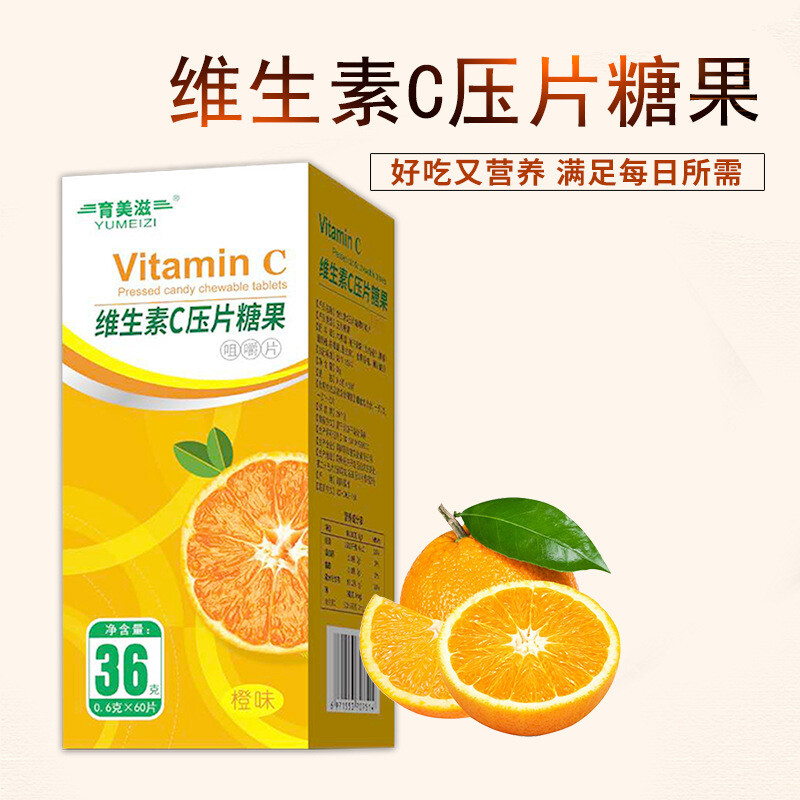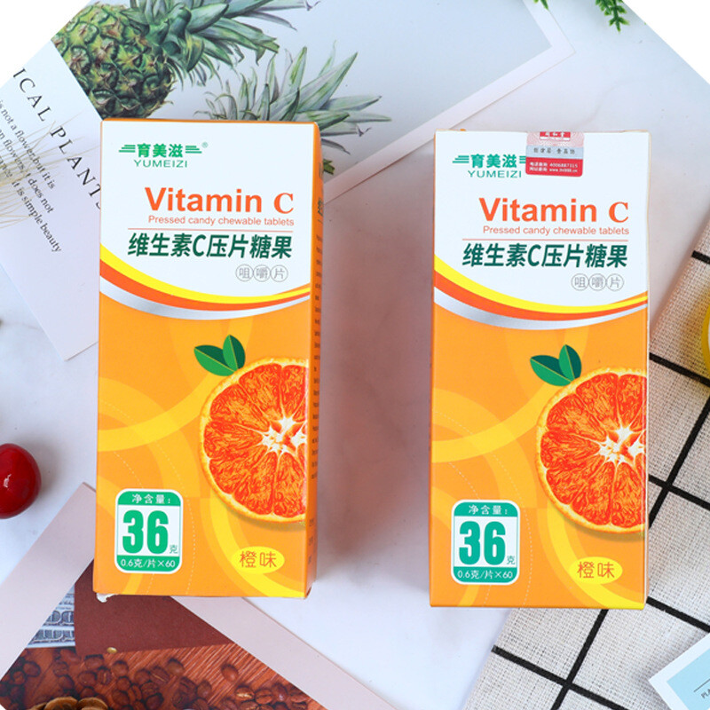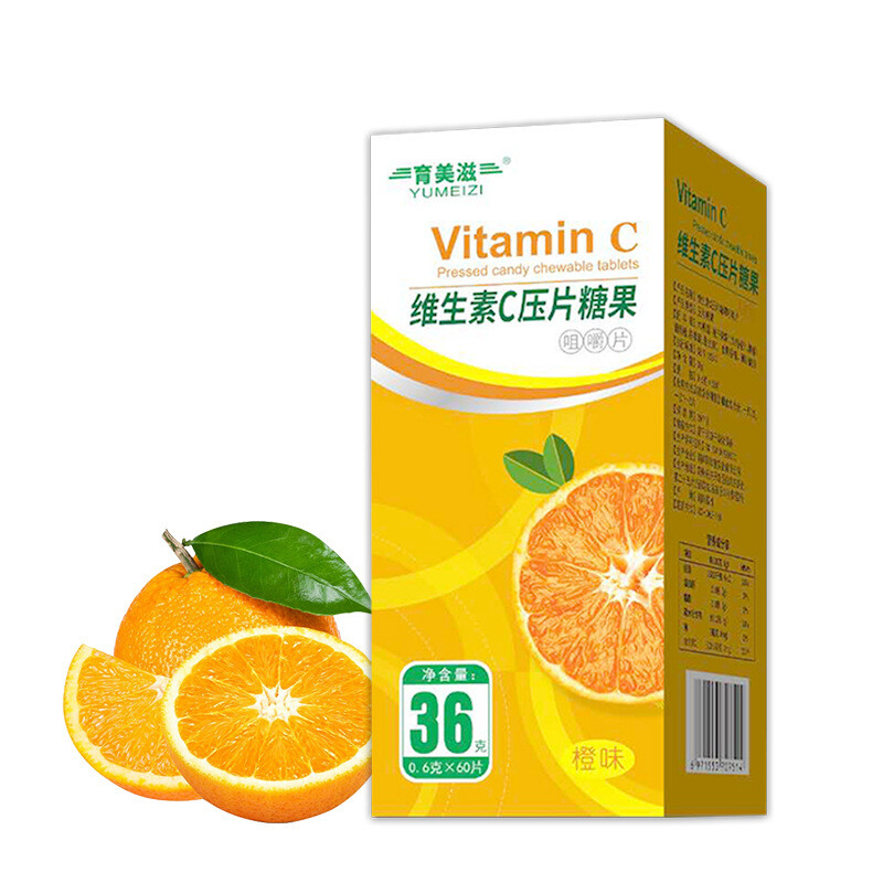 Storage conditions: room temperature Shelf life:24 months Unsuitable for people:Infants and young children Storage Method:Cool and dry Production date:See package Name:Vitamin C Chewable Tablets Production Licence Number:SC11341019200073 Application object:6 years old and above Packing specification:0.6g*60 tablets/box Net content:36g Main raw material:Vitamin C Type:Pressure Candy