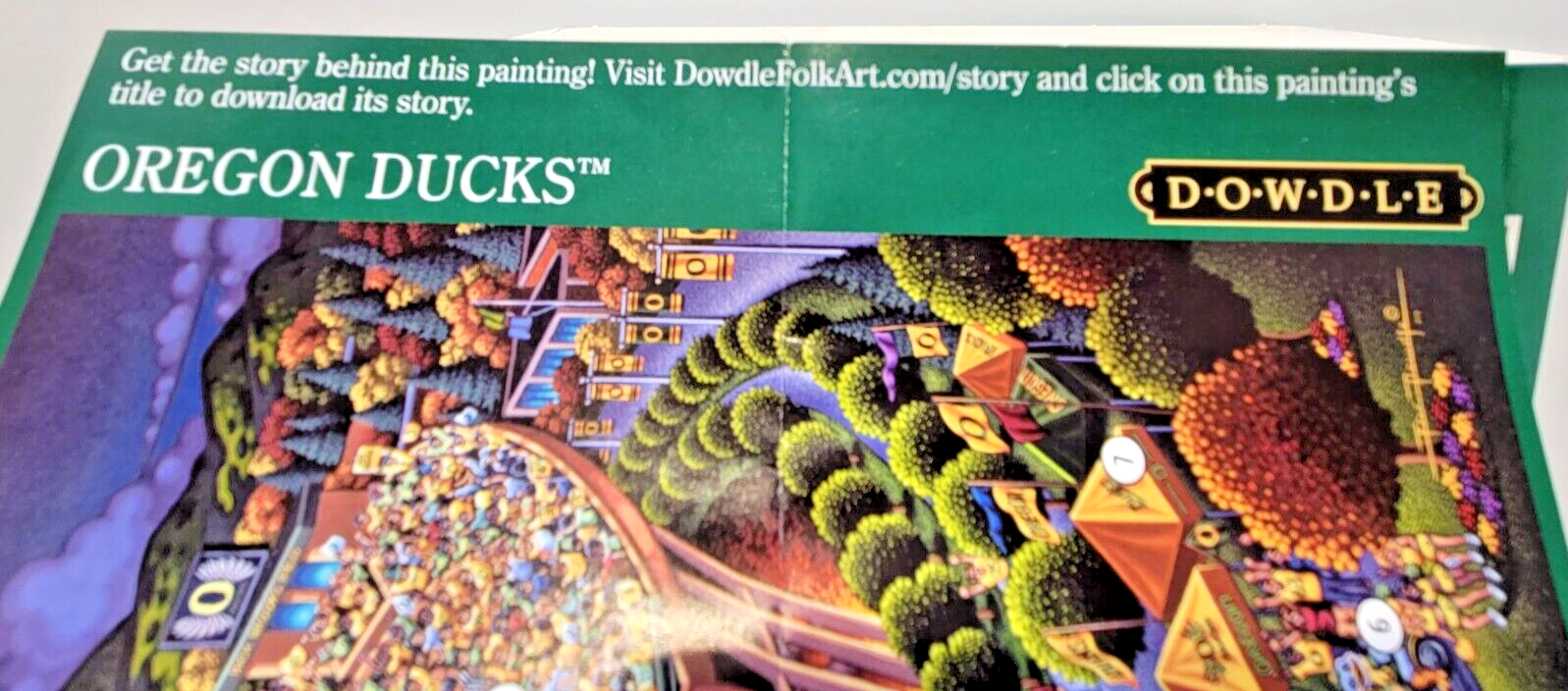 "University of Oregon Ducks" Folk Art - 500 Piece Jigsaw Puzzle University of Oregon treatment from Eric Dowdle. We did not work the puzzle or count the pieces, so we cannot guarantee that all pieces are present. Each item is carefully packaged to prevent any damage and is shipped immediately with tracking.