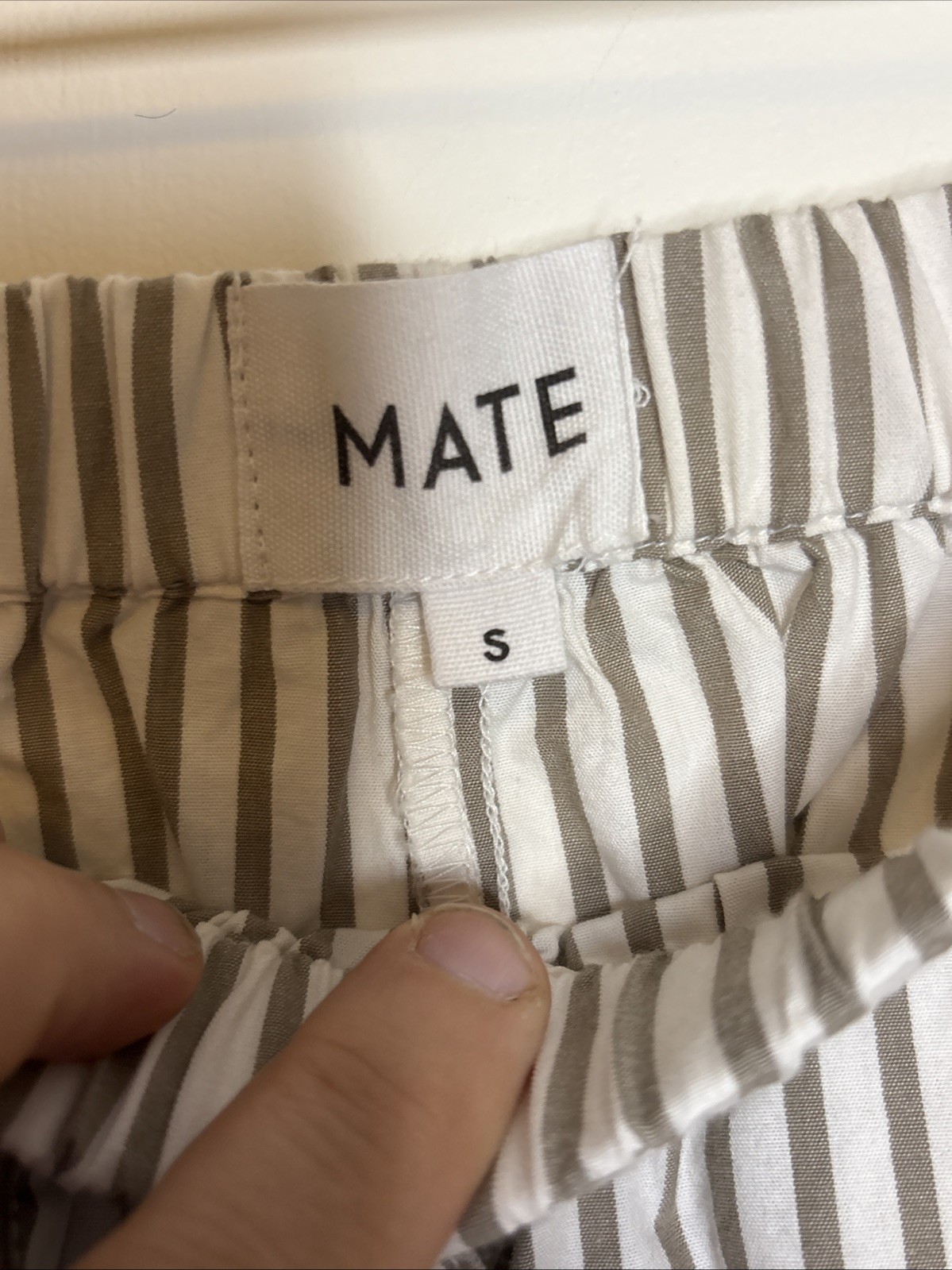 Pattern:StripedBrand:Mate The LabelFeatures:Pockets, ComfortSeason:Spring, SummerSize Type:RegularType:PantsDepartment:WomenFit:RelaxedRise:High (Greater than 10.5 in)Color:BrownStyle:ParachuteMaterial:CottonSize:SInseam:29 inClosure:Drawstring, Pull On