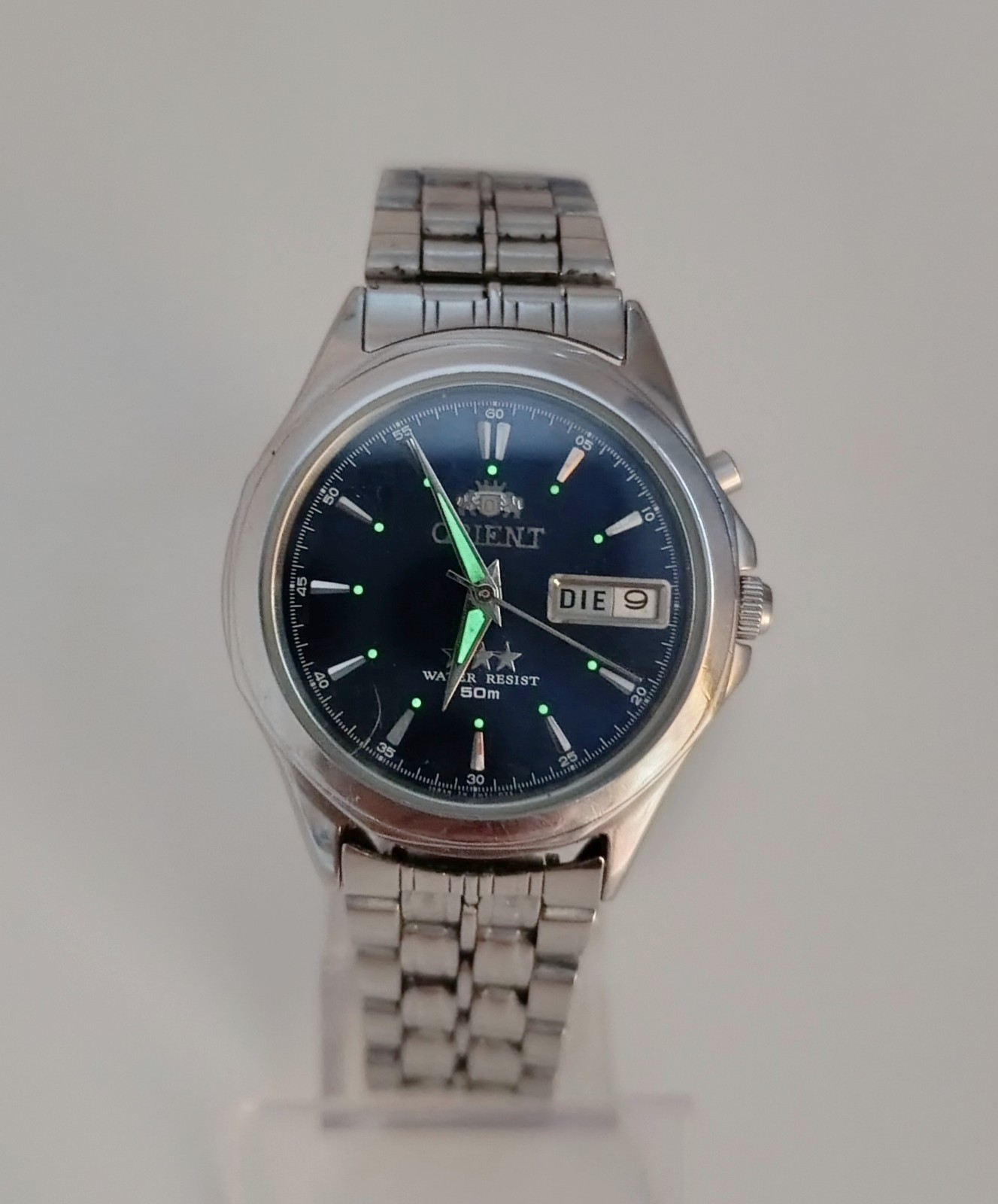 Men's wristwatch Orient 3-stars EM 5C-CO CA. Automatic, 22 jewels mechanism with day of the week and date indicator. Water resist 50 m. Stainless steel case and bracelet, mineral glass. The watch is in good and working condition, runs well, hands and calendar are translated. Was in use, with high magnification you can see micro scratches. Ask questions. There are many other watches, see new ads. Thank you all for your attention and interest in my ads