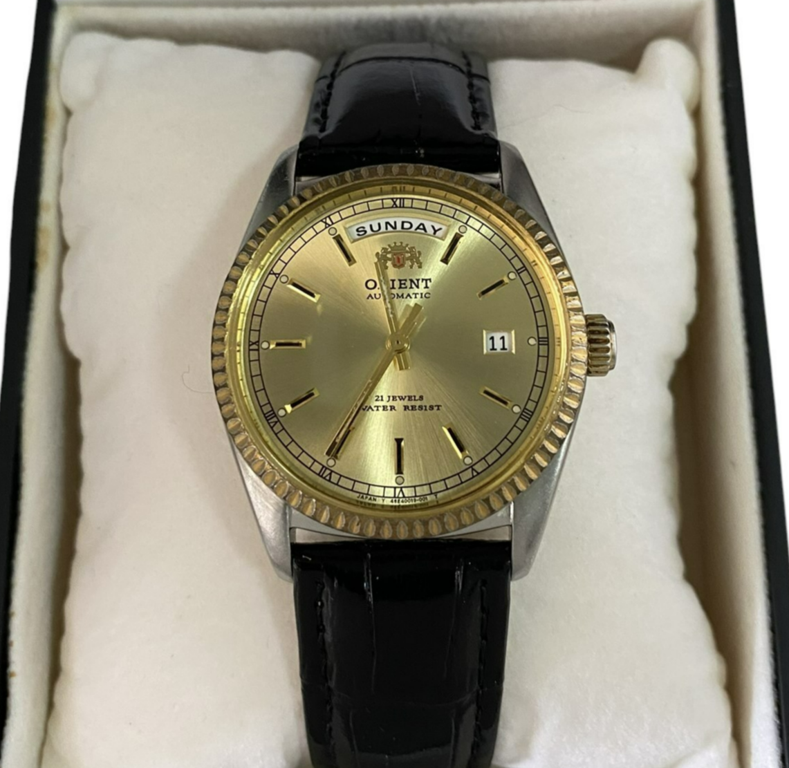 This Orient President Day-Date is a stunning rare find! The gold dial pops with elegance, and the 36mm stainless steel case wears perfectly. The in-house 21-jewel movement keeps excellent time, and the screw-back case adds durability. Love the vintage charm with modern reliability. Shipping is fast, and the watch looks even better in person—definitely a collector’s piece worth owning!