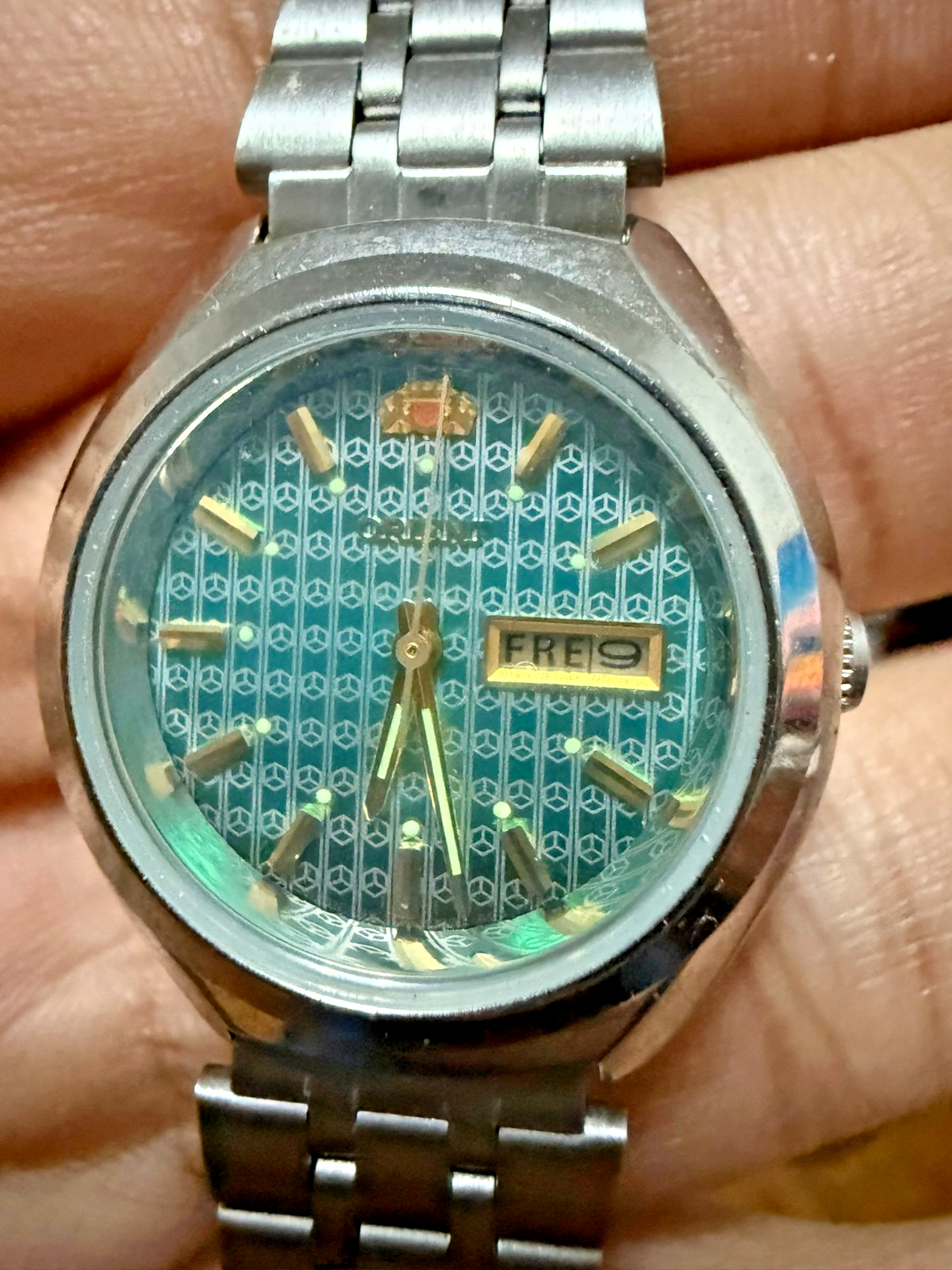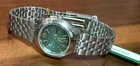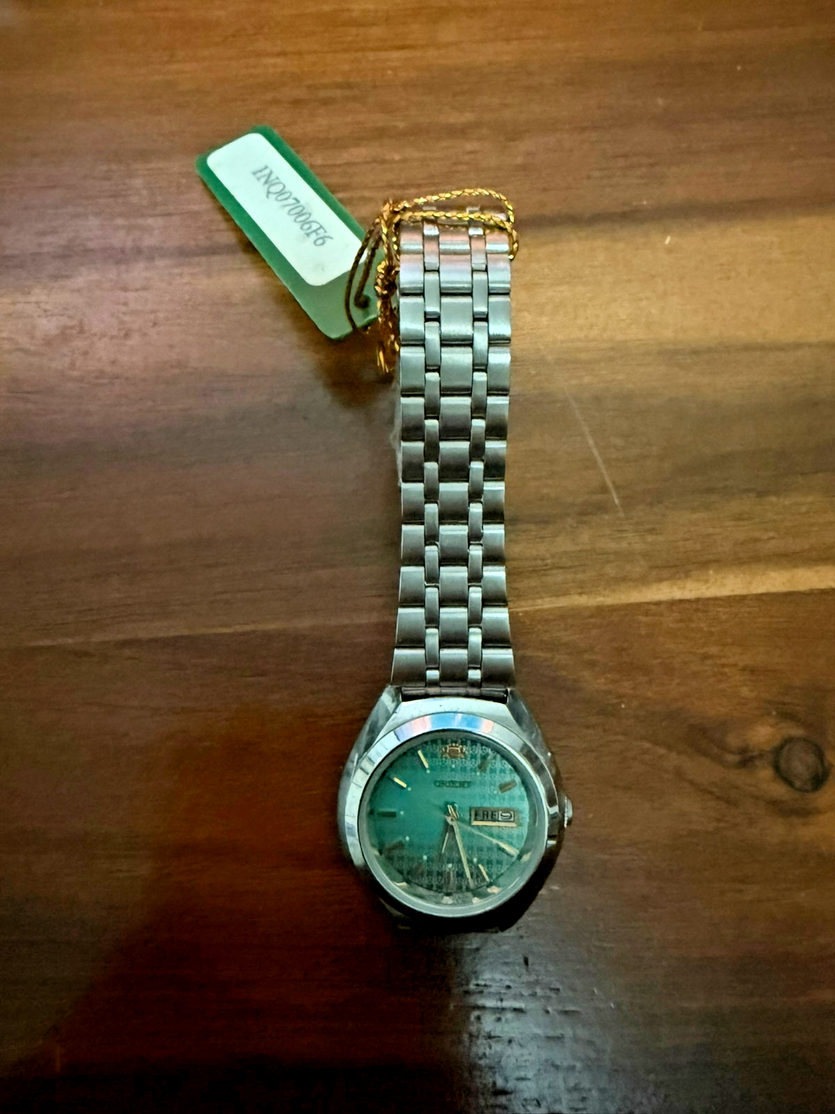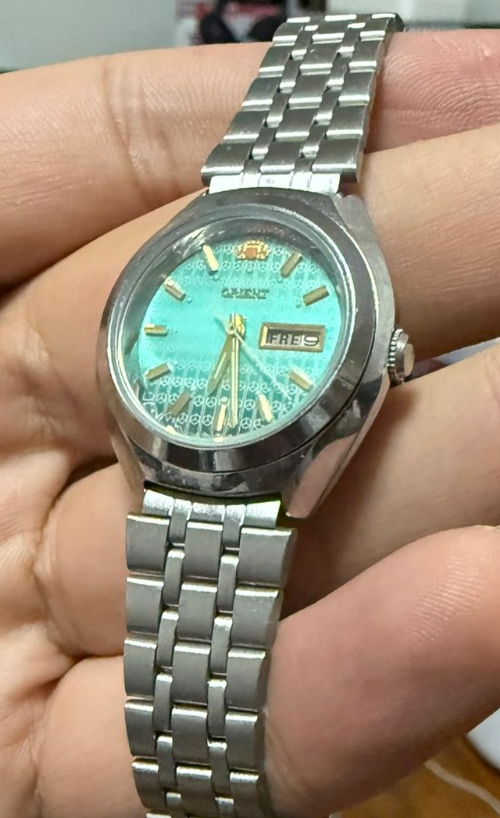 This elegant Orient vintage women’s automatic watch features a stunning turquoise textured dial with gold-tone markers and hands. Designed in the 1990s , it combines classic Japanese craftsmanship with vibrant retro style. The compact stainless steel case is paired with the original folded-link bracelet, giving it a sleek, timeless silhouette. The day-date display at 3 o’clock adds everyday functionality, while the automatic movement keeps time with the motion of your wrist — no battery required. This timepiece is in near mint, unworn New Old Stock (NOS) condition, still retaining its original factory hang tag and clasp protector . It may have extremely light shelf wear from storage, but has never been used. 🔹 Key Features: Brand : Orient Dial : Turquoise textured with gold-tone hour markers and hands Display : Day-Date window at 3 o’clock Movement : Automatic (self-winding) Condition : NOS (new old stock), unworn with original tag; minor shelf wear possible Bracelet : Original stainless steel folded-link bracelet Size : Petite vintage women’s case – see photos for scale A rare opportunity to own a colorful vintage automatic watch in pristine condition — perfect for collectors or anyone who appreciates classic Japanese design and vintage charm. Most watches like this NOS run for 200-225 online, but I need to clear stock which is why I am pricing it accordingly. Let me know if you have any questions!