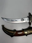 The Oriental Dagger Knife features a blade made of stainless steel with an etched design. The handle is crafted from wood and detailed with brass and copper accents, creating a visually striking piece. This dagger has a single cutting edge and an original design, showcasing intricate craftsmanship that is both functional and decorative. Made in China, this collectible item embodies a fusion of traditional Oriental aesthetics with modern stainless steel material.