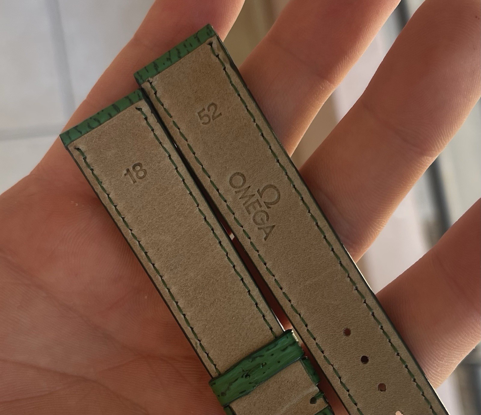 Modified Item:NoUPC:Does not applyMaterial:Calfskin LeatherMPN:Does Not ApplyTheme:LuxuryBand Width:18 mmDepartment:MenColor:GreenCountry/Region of Manufacture:SwitzerlandCompatible Brand:OMEGAgtin13:Does not applyYear Manufactured:2010-NowBrand:OMEGABand Type:Two-Piece StrapType:Wristwatch BandCompatible Model:Multiple Models