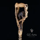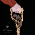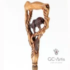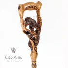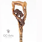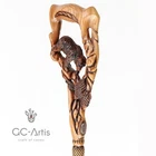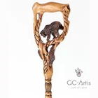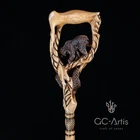 Grizzly Bear Fishing Salmon - Light wood Walking Stick Cane Unique Art Wood Carved Hand Crafted Designer Walking Stick cane ------------------------------------------------------ New fully functional Wooden Walking Stick with a high quality rubber tip This is 100% Authentic walking cane made by GC-Artis Creative Workshop ORIGINAL CANE HAS THE METAL MEDALLION with the ARTIST'S LOGO. It's a really Emotional Energy Wood Art - Directly from the Artist Woodcarver This is done with love from a natural material and carries a strong energy to its owner: We used an Oak which is deeply meaningful in mythology - slow growth, very strong and impressive wood Consist of 2 parts: handle & shaft are connected by reliable screw connection. CONDITION: New SIZE: 36-37 inches in length (please ask for cutting) SUPPORTS: up to 250 lbs USE: unisex, fits for right hand ONLY HANDLE MATERIALS: Solid OAK wood SHAFT MATERIALS : Solid OAK wood WEIGHT: 520 gram approx PROCESSING : Most of operations are made manually ARTIST: Ukrainian artist Maestro SHESTOPALOV SERGIY Attention! Do not buy GC-Artis canes from Indian sellers of rough quilting! They stole our photos and sell fake counterfeit not as pictured. COMPOSITION: The Salmon archetype is connected with the ability to flow from spawning grounds of birth great distances and live out there in the ocean many years, until it is time to consummate the ultimate journey of sacrifice, swimming against the flow of any tide or obstacle in order to reach a destination of procreation - manifesting fertility to the core. The Bear and salmon together manifest the ability to stand ones' ground and hoard whatever is needed to meet any future and challenge (bears rely on the energy of salmon to prepare for tough times of hibernation). Using this cane, then - is about accomplishing a life track of well accomplished resilience. ------------------------------------------------------ FUNCTION: This walking cane fitting as an additional fashion accessory, underlying individual style for men & women, ladies & gentlemen over city avenues and suburb/village anes, or walking in the wild as additional Protection against wild animals as well as a pleasant walking instrument for old elderly people. This walking stick an excellent addition for any art collection, an original gift idea for Birthday, Mother's / Father's / Veteran's day or an unusual prop for an costume party, original photo set, theater or movie staging It is designed to be perfectly balanced for walking conveniently in raised reliability. ------------------------------------------------------ RECOMMENDATIONS: Recommendations for use 1. Please take care of cane from falling onto a hard surface such as concrete or asphalt, or ceramic tile. It tends to fall if you left a cane to lean on the wall and can get a crack or delicate details or fracture. So we recommend to use a hand strap. 2. Before use, make sure the screw connection is tightly screwed. Otherwise, you may get unstable support or damage the cane. This connection is designed for convenient shipment or transportation of a walking stick when traveling in luggage is not often only. But this is not intended for every day assembly / disassembly. The meteoric thread can become weak after a frequent cycle of twisting and untwisting. 3. Please check that you are leaning on the cane correctly. The main force should be directed as close as possible to the shaft but not the rear end of the handle. Incorrectly positioning can cause shaft bend and discomfort and even breakage of the shaft. 4. Use the right tip. Each GC-Artis cane has a standard, NOT medical, summer rubber tip in a set. If you need a winter tip or a medical one (made of softer material provides enhanced cushioning) you should buy it additionally at medical store. Also use soap or candle wax to put a rubber tip on easily. Sizing recommendations 1. The optimal length of the cane is a very individual parameter. It depends not only on your height but also on the length of your arms, the posture, the manner of walking and the thickness of the soles of the shoes you wear. 2. Usually we propose to send the standard 36 inches length walking stick cane. If necessary, you can shorten a wooden shaft on a place easily using any saw. You'll receive the rubber tip in the set which hide any traces of cutting. It is a good idea to use a paint tape to protect the wood from splitting while cutting off the shaft (wind the shaft above the cut-off point). 3. But If you want me to cut your cane before sending, please try to determine the optimal length very accurately using standard method you will find in Google, but do not remind to consider thickness of your shoes sole! It is easy to make it short but very hard to make longer again. Storage and care recommendations 1. We do not recommend to storing the cane near a heating appliances and in the hot sun. The wooden parts can become more brittle with excessive drying, and this can lead to a crack at high load. 2. Each walking cane made by GC-Artis has a professional varnish coating which protects against common atmospheric phenomena like light rain or any short-term wetting with non-aggressive liquids. But increased moisture for a long time or immersion in water can lead to deformation of the wooden parts. Contact with aggressive chemical liquids and solutions can destroy the varnish coating. 3. We recommend to use warm water with a soap solution or any certified cleaning agent for wooden goods and furniture to clean your cane. It's safe. After cleaning, wipe with a dry cloth. Also we recommended once a year to polish the surface of the cane in order to restore the gloss of lacquer coating and to remove plaque oxidation from metal parts and minor scratches. Use professional products for polish. ------------------------------------------------------ WARRANTY: We provide 30 days full warranty & 60 days limited warranty against manufacturer defects & hidden defects of materials. Buyer can s