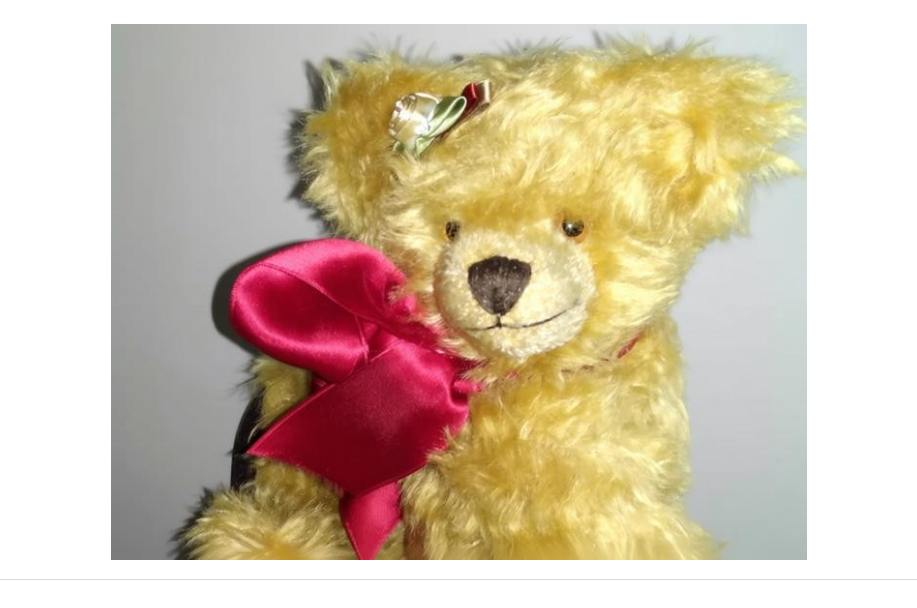 Size: 36 cm (14 inches). There's a button on the back of the head and a paper authenticity tag on the chest. The bear is made of fluffy beige mohair and stuffed with straw. The head and paws are swivel and secured with cotter pins. Glass eyes and an embroidered nose. The paw pads are made of satin fabric. The teddy bear has a growl in its tummy, a clear, drawn-out sound.