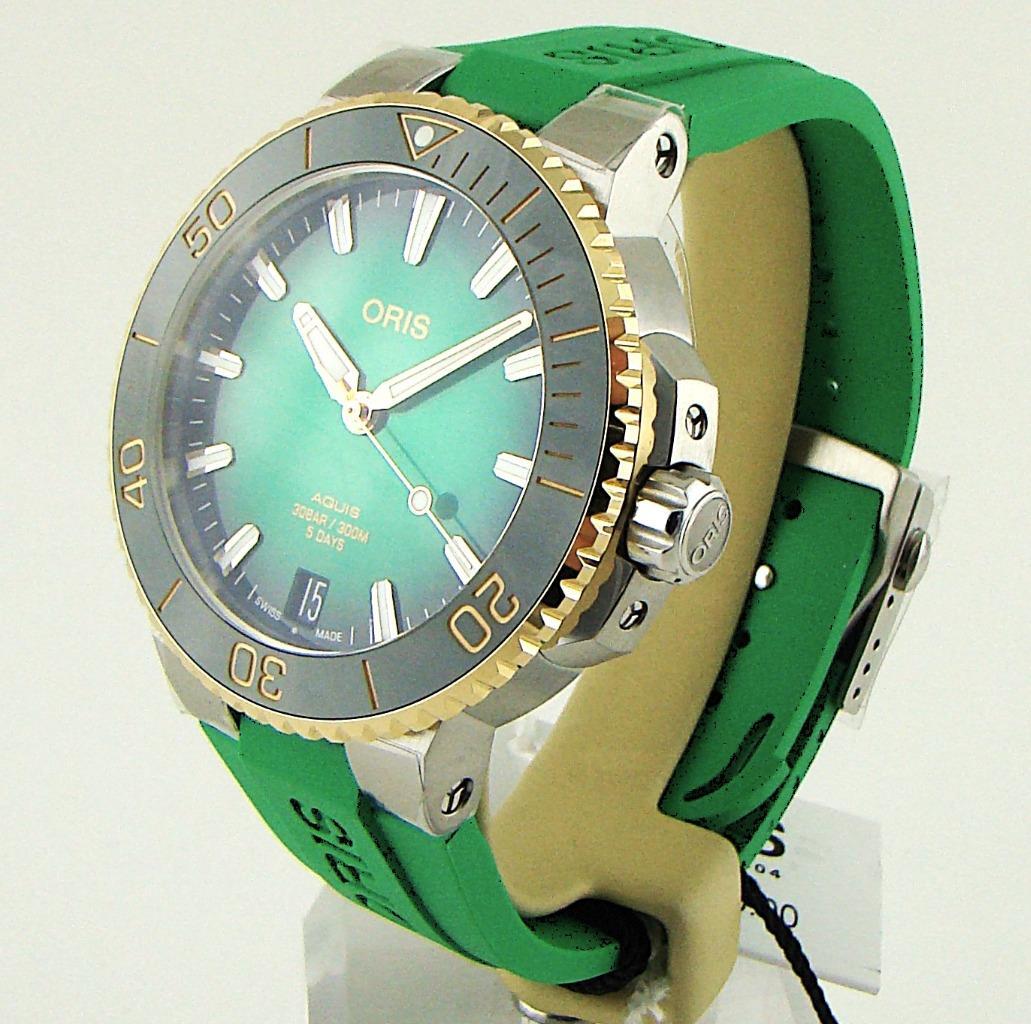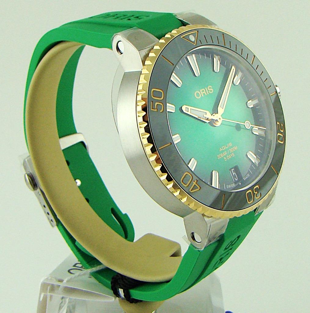 Case Size: 41 mm Dial Color: Green Movement: Mechanical (Automatic) Number of Jewels: 21 Jewels Band/Strap: Two-Piece Strap Band Color: Green Bezel Type: Unidirectional Rotating Manufacturer Case Color: Silver Water Resistance: 300 m (30 ATM) Closure: Safety Strap Clasp Bezel Color: Green Display: Analog Features: Water-Resistant, Date Indicator, Self-Winding, Sapphire Crystal Dial Pattern: Sunburst Band Material: Rubber Indices: Baton Indexes Model: Oris Aquis Hour Hands Color: Gold, White Watch Shape: Round Manufacturer Band Color: Green Reference Number: 01 400 7769 6357-07 4 22 77FC Manufacturer Dial Color: Green Caseback: Exhibition Type: Wristwatch Hour Marker Color: Gold, White Case Material: Stainless Steel Department: Men Case Color: Silver Brand: Oris