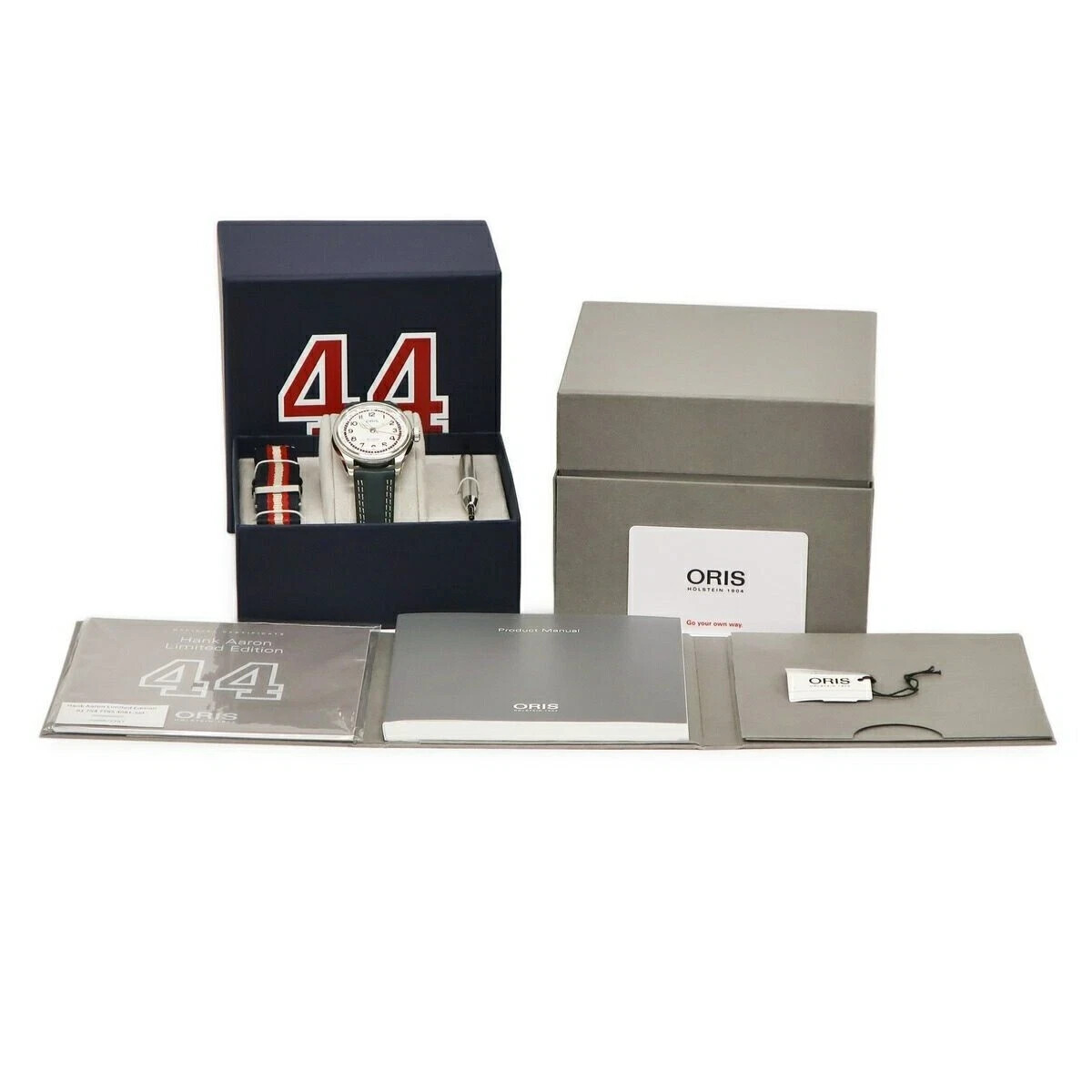 The Oris Big Crown Hank Aaron Limited Edition Men's Watch 01 754 7785 4081-Set is a luxurious timepiece made of stainless steel with a silver case and a blue leather strap. This Swiss-made watch features a date indicator, sapphire crystal, and Arabic numeral indices, giving it a classic yet formal style suitable for various occasions. Limited edition and water resistant up to 50m, this watch comes with its original box and papers, making it a valuable addition to any watch collection.