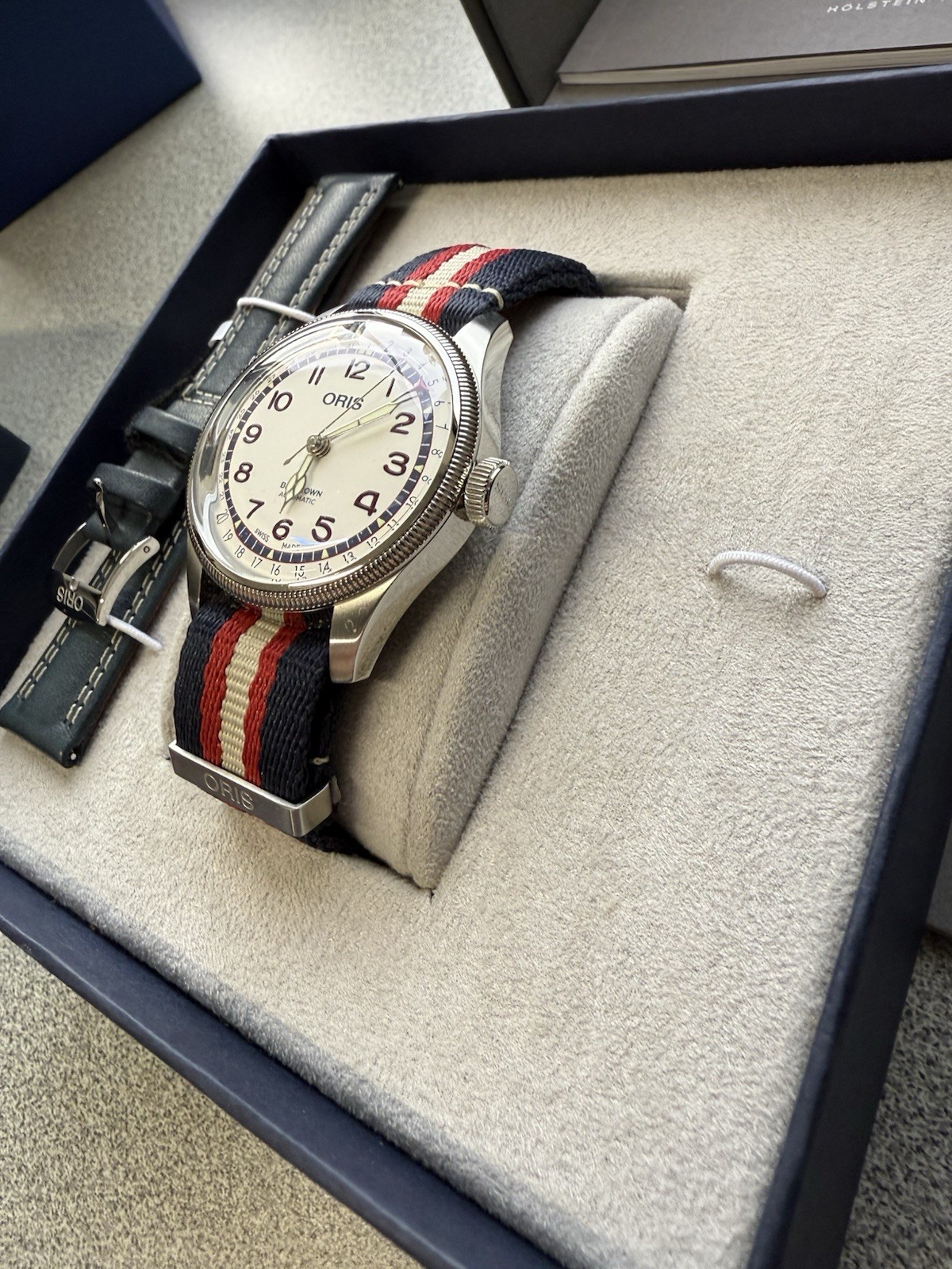 The Oris Big Crown Hank Aaron Limited Edition Men's Watch 01 754 7785 4081-Set is a luxurious timepiece featuring a silver stainless steel case with Arabic numerals on a silver dial. This Swiss-made watch has a 40mm round shape with a date indicator and sapphire crystal. The watch comes with a two-piece blue leather strap and a water resistance of 50m. With its limited edition status and original box, this classic and stylish watch is perfect for any formal, casual, or dressy occasion. Full set. Worn handful of times.