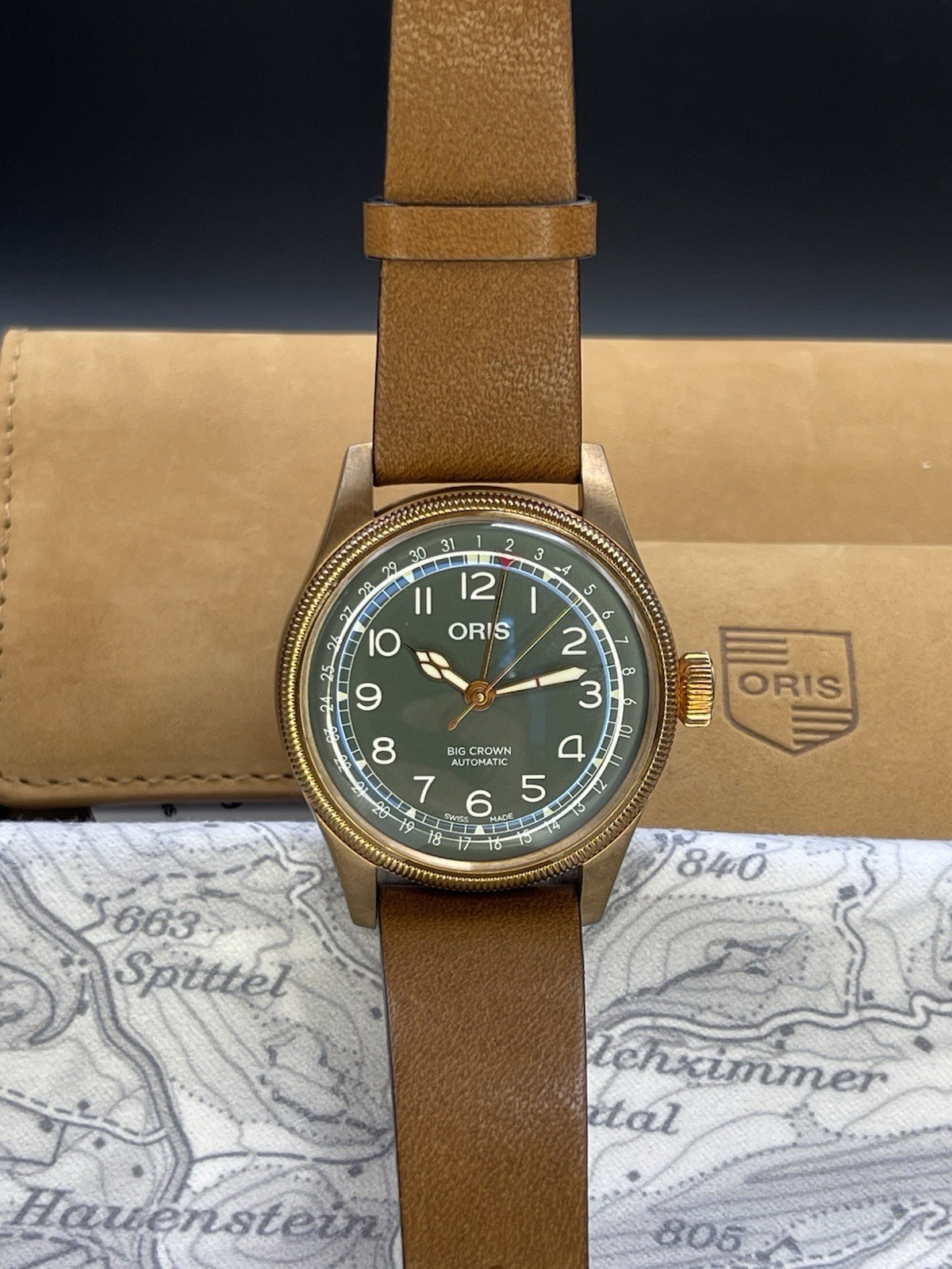 FOR SALE Oris Big Crown Pointer Date Ref: 01 754 7741 4365 Bronze 40mm case Complete Set - Box - Warranty Card - Leather traveling pouch MSRP - $2,500 Price - $1,650 + ✈️ Case material - Bronze Strap material - Leather Movement - Automatic Complication - Pointer Date Crystal - Sapphire Crystal Located and Ships from Sarasota, FL📍 Not the perfect timepiece for you? Lets discuss how to get that perfect timepiece on your wrist