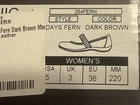 This is a pair of women's Vionic Orthaheel shoes in dark brown leather with an elastic decorative strap. They are slip-on style with a low heel height, suitable for casual occasions. The shoes feature comfort technology and are designed for standard shoe width. They are ideal for summer, fall, and spring seasons. The shoes are a size 3 in UK sizing, which corresponds to a size 5 in US sizing.