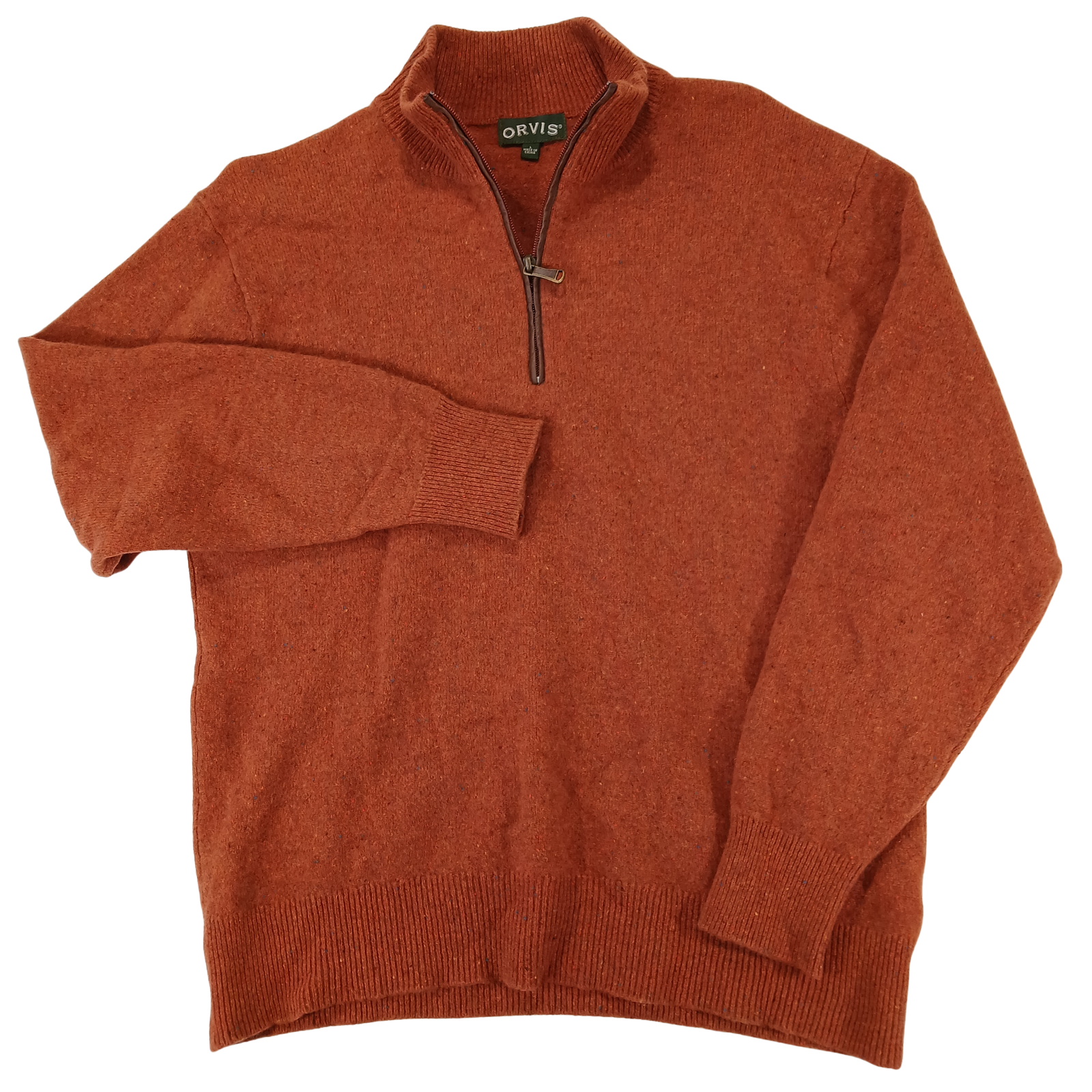 Classic Orvis quarter-zip wool sweater in a rich rust / burnt orange color with subtle flecking throughout. Features genuine suede trim along the zipper for a refined outdoor look. Made from 100% wool with ribbed cuffs and hem for a comfortable fit. A versatile layering piece that works well for casual wear, travel, or outdoor activities. Very good pre-owned condition with very minimal sign of wear Please see photos for full condition details.