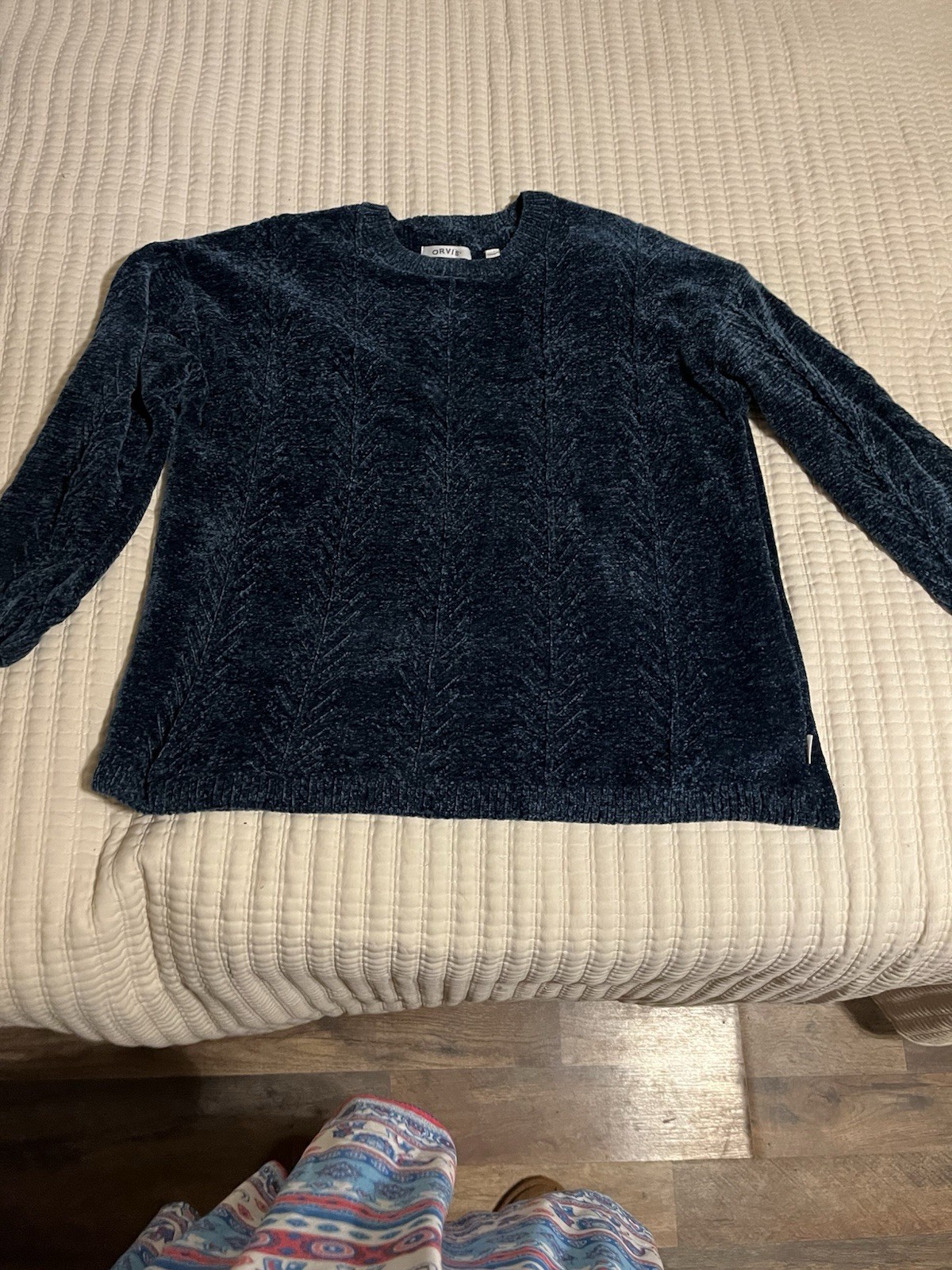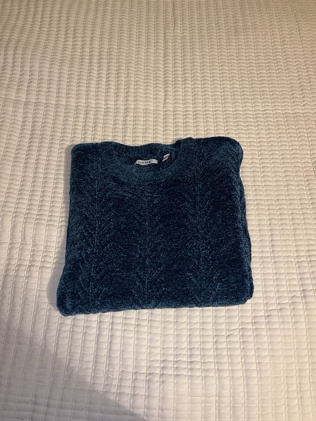 The Orvis Chenille Soft Cable Knit Size XXL Long Sleeve Cozy Blue Sweater is a comfortable and stylish addition to any woman's wardrobe. With a solid blue color and cable-knit design, this sweater is perfect for both casual and workwear occasions. The round neckline and long sleeves add to its cozy appeal, while the lightweight and super soft material ensures comfort throughout the winter, fall, and spring seasons. Whether you're traveling, attending a party, or simply running errands, this sweater from Orvis is a versatile and stylish choice.