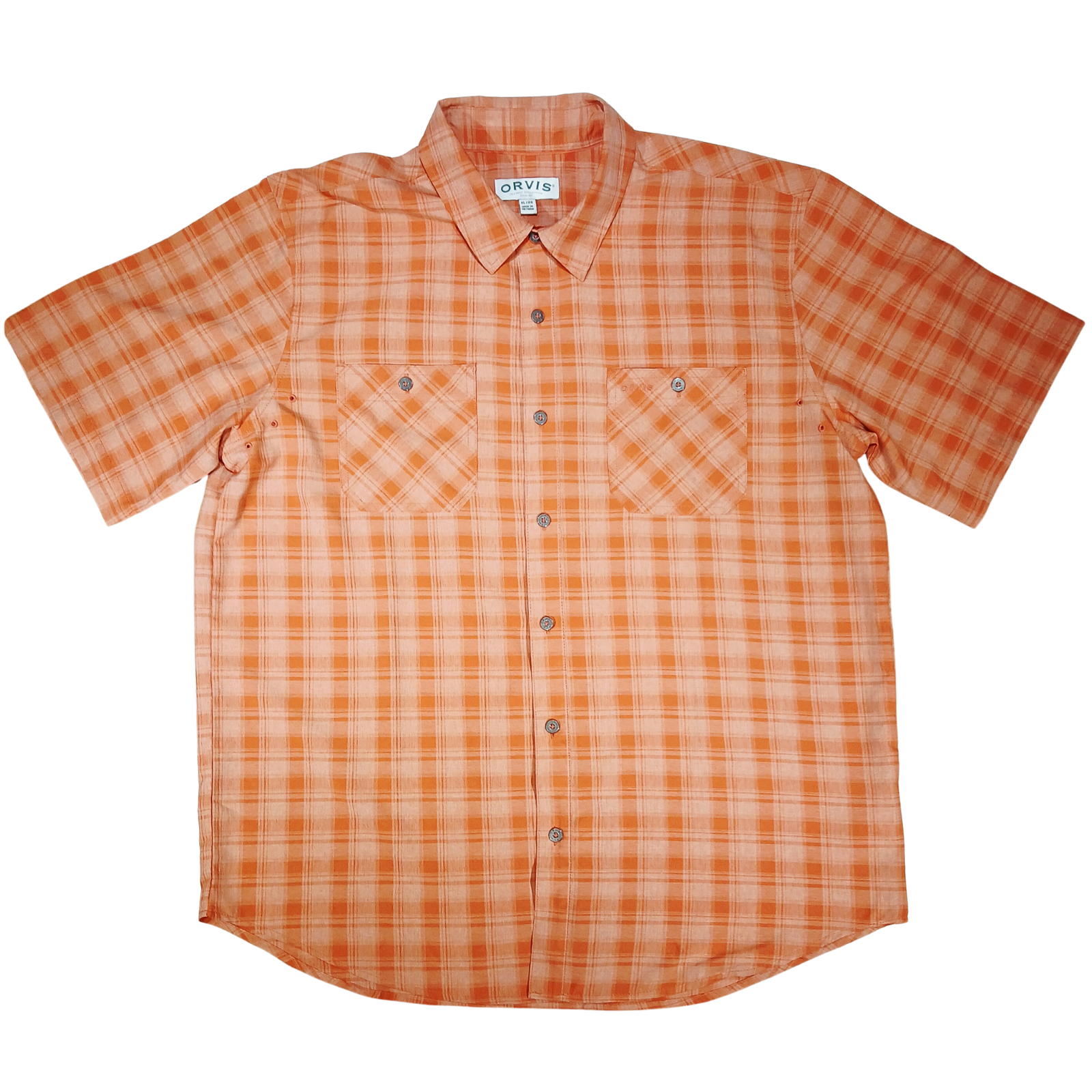 Men’s Orvis Classic Collection short sleeve button-up shirt in an orange plaid pattern. Lightweight breathable, and quick drying polyester fabric with a vented back and airflow eyelets , making it ideal for fishing, hiking, travel, or warm-weather casual wear. Features dual chest pockets with Orvis logo buttons and a relaxed outdoor fit. A dependable Orvis staple that wears well and lasts. Perfect for spring and summer. Brand: Orvis Collection: Classic Collection Size: XL / EG Fit: Relaxed Color: Orange plaid Sleeve: Short sleeve Fabric: 100% Polyester Made in Vietnam Chest pockets with button closure Vented back for airflow
