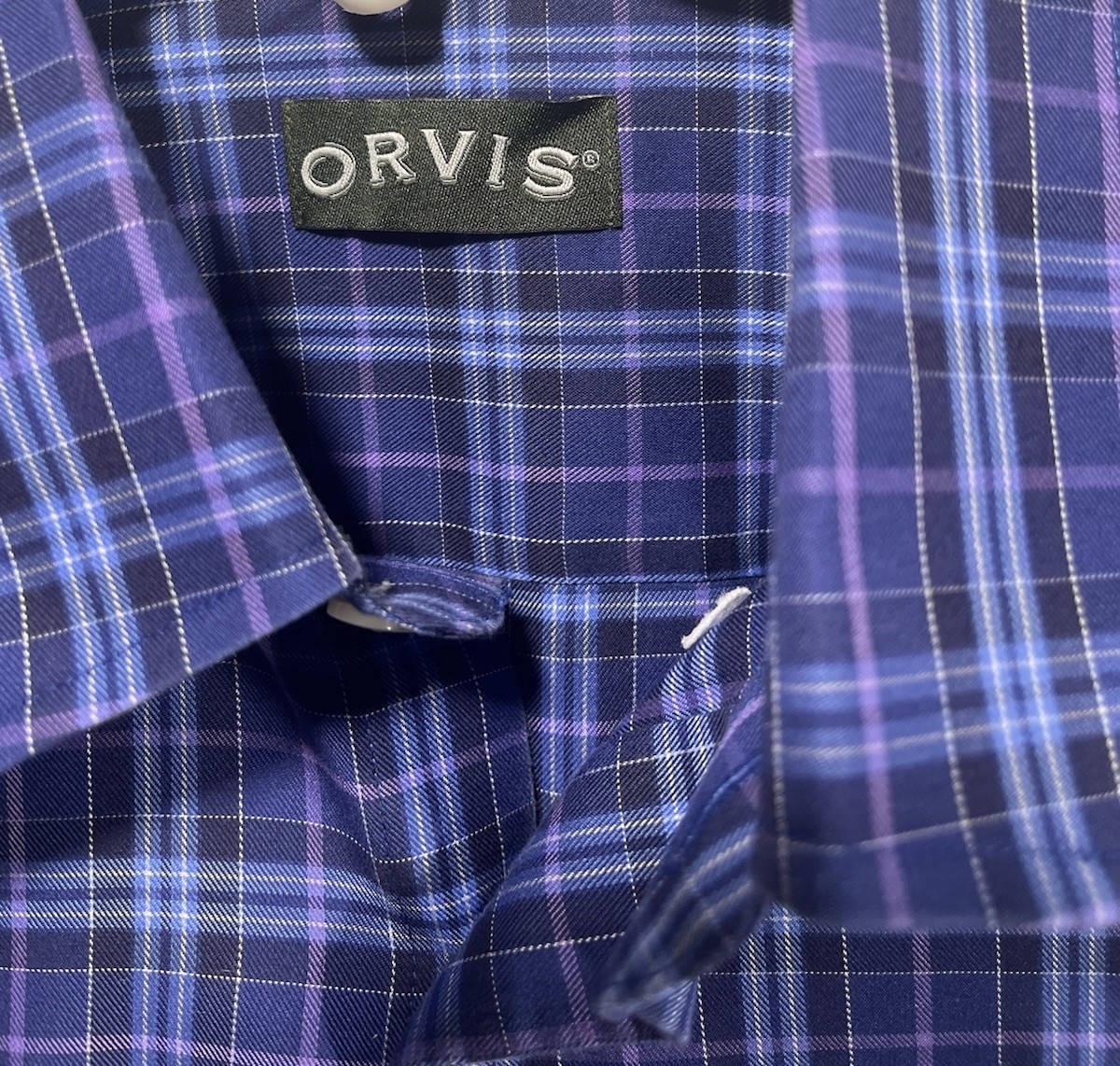 The Orvis Shirt for men in size Medium features a red plaid pattern with long sleeves, a collared neckline, and button closure. Made from a blend of polyester, nylon, spandex, Tencel, and cotton, this shirt is perfect for various occasions such as travel, casual wear, and workwear. It also includes embroidered logo accents, embodying a nature, fish, and outdoor theme, making it ideal for fishing, hiking, or any outdoor adventures. D-26