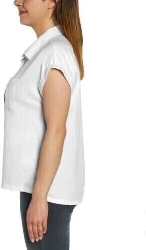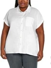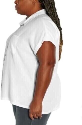 This is an Orvis women's short sleeve linen blend shirt in white, size L. It features a collared neckline, button closure, and a solid pattern. The shirt is designed for casual or workwear occasions, with a regular fit and lightweight material suitable for summer. Easy to care for with machine washable instructions, this button-up shirt is a basic wardrobe staple for women.