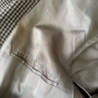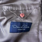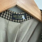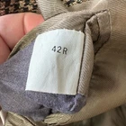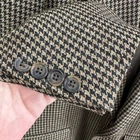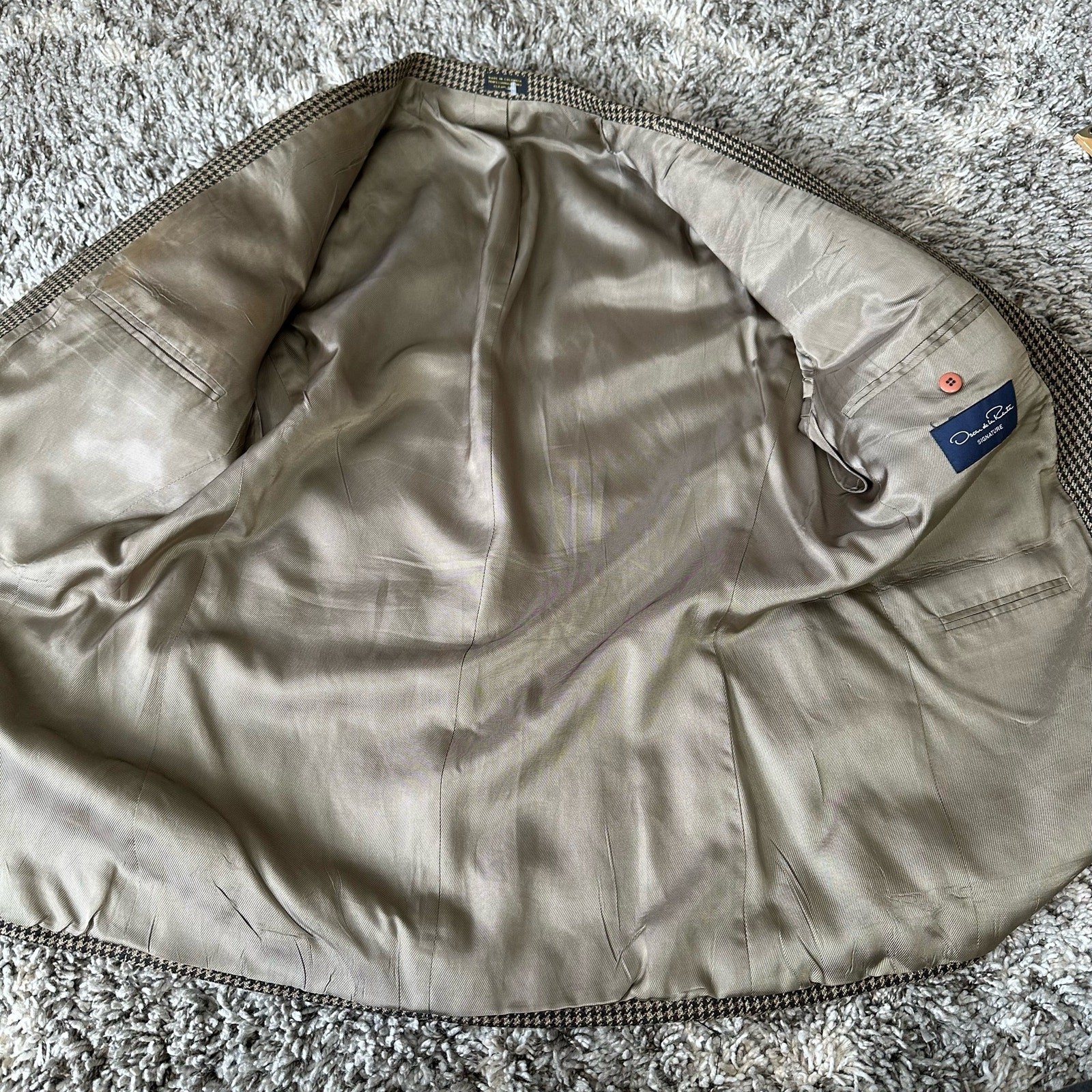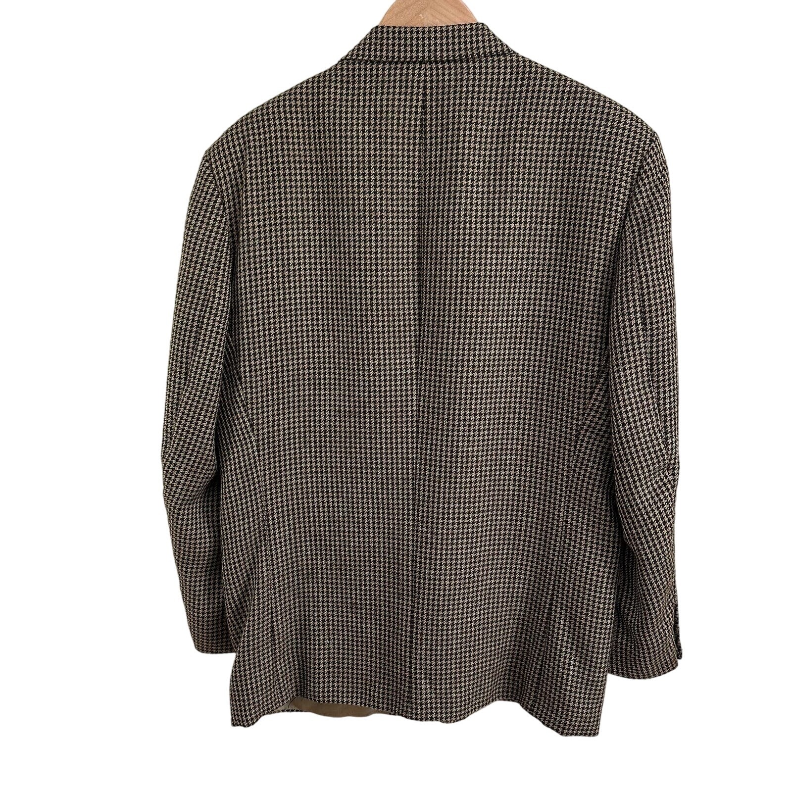 Oscar De La Renta Brown Houndstooth Plaid Blazer Sport Coat 2 Button 42 42R Size 42R, approximate measurements in photos. No materials tag but it's not scratchy. It could be wool or even silk. Very good condition. One button on sleeve is chipped and there is a pick in the fabric near that (see closeup photo) but otherwise no flaws or notable wear.