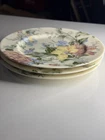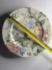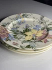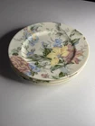 This set includes three Oscar De La Renta dessert plates in the English Tapestry pattern. Each round plate has a diameter of 8.5 inches and features a pastel color scheme of rose, blue, green, and yellow. The plates are stackable, dishwasher safe, and made of porcelain. They are decorated with floral designs, suitable for all occasions, and were manufactured in Japan in 1990. The style is described as Cottage.