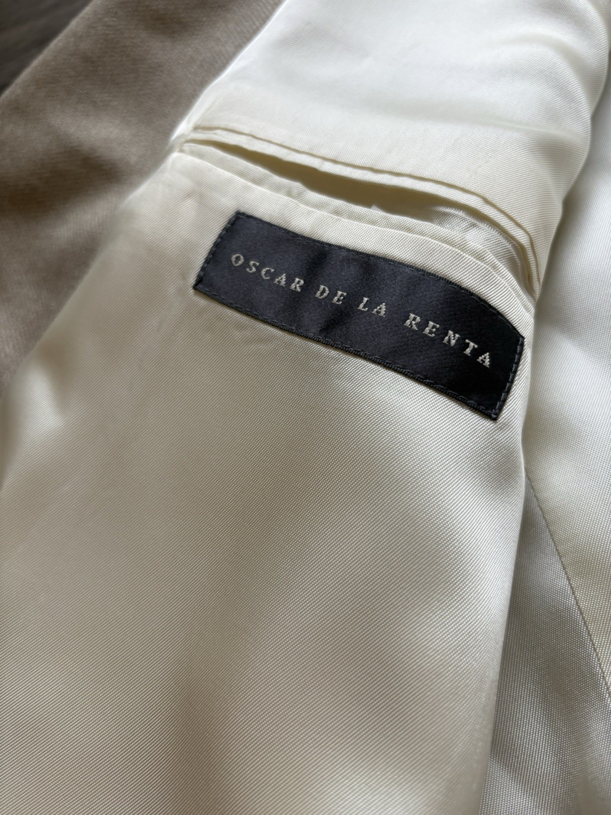 The Oscar De La Renta Sport Coat is a stylish and classic vintage blazer in a sophisticated tan color made from a luxurious silk and wool blend fabric. This single-piece blazer features a regular fit with a two-button jacket sleeve style and a satin-like polyester/acetate lining for added elegance. Designed for men in size 44R, this timeless piece exudes a sporty yet refined theme, making it a versatile and elegant addition to any outfit. Blazer is missing top button, but have original button to send with item for replacement.