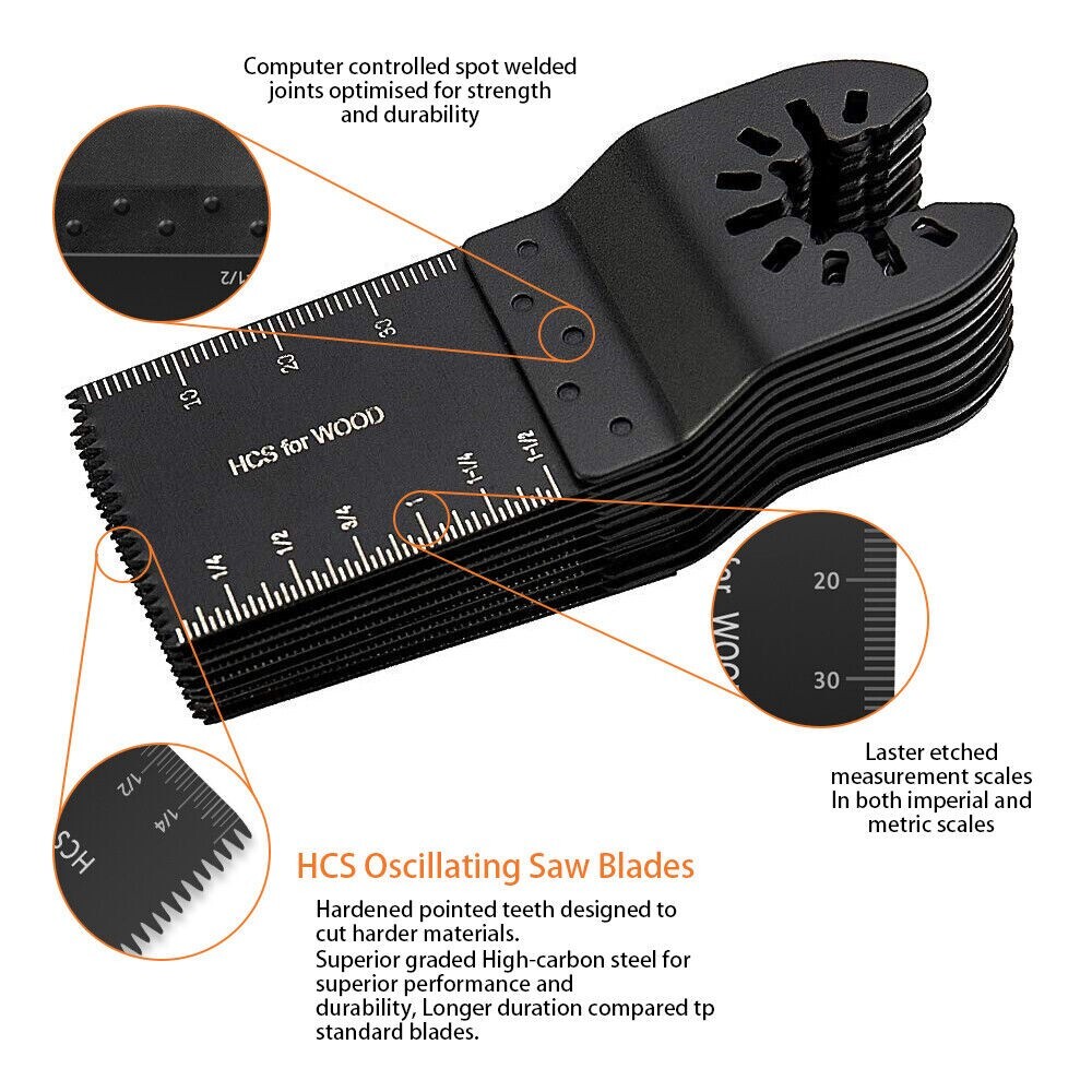 Features & Details Material: high carbon steel Width: 34mm/1.37'' Length:90mm/3.70'' Used for cutting wood, most plastics, gypsum board, etc. A comprehensive universal multi-tool kit suitable for most wired or cordless tools on the market. High-quality materials, durable and long service life. Professional quality multi tool with measurement scales (mm/cm and inches). Easy to install and use. Package Included: 50x oscillating saw edges Features & Details Material: high carbon steel Width: 34mm/1.37'' Length:90mm/3.70'' Used for cutting wood, most plastics, gypsum board, etc. A comprehensive universal multi-tool kit suitable for most wired or cordless tools on the market. High-quality materials, durable and long service life. Professional quality multi tool with measurement scales (mm/cm and inches). Easy to install and use. Package Included: 50x oscillating saw edges