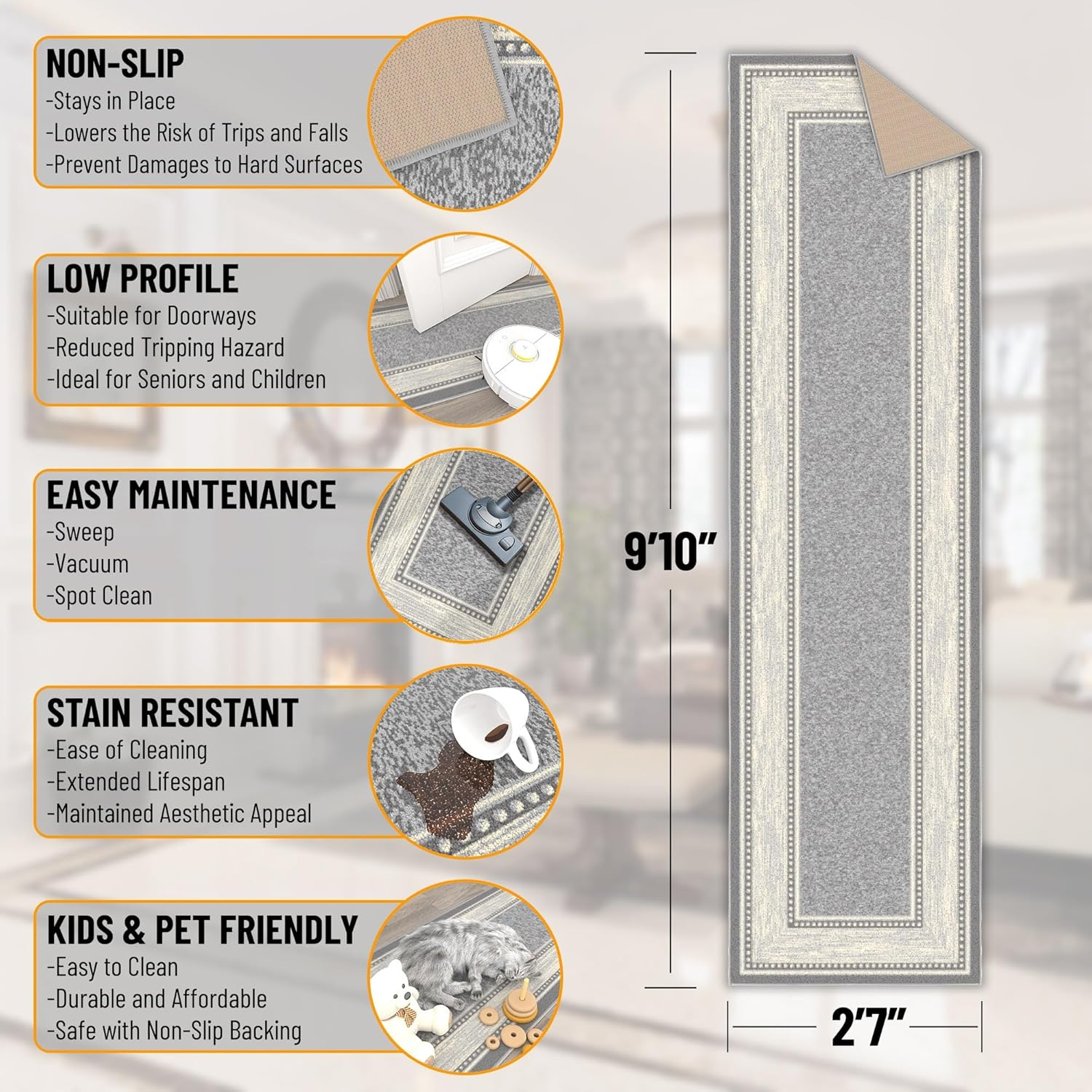 Store New Arrivals Add to Favorite View Feedback Ottomanson Hallway Runner Rug 2'7" X 9'10" Non Slip Border Area Rugs Easy to Clean Laundry Rug Runner Durable & Pet Friendly Floor Carpet Runners for Hallways Entryway Living Room Kitchen, Light Gray Description Item model number OTH2203-3X10 Style Border Material Rubber Weave Type Machine Made Pattern Bordered Age Range (Description) Adult Country of Origin Turkey Is Stain Resistant No Theme Contemporary Number of Pieces 1 Room Type Entryway, Kitchen, Bedroom, Living Room, Hallway Brand Ottomanson Min Required Door Width 3 Feet Model Name Border Collection Rug Form Type Runner Item Thickness 0.2 Inches Indoor/Outdoor Usage Indoor Water Resistance Level Not Water Resistant Is Autographed No Item Weight 5.3 Pounds Pile Height Low Pile Construction Type Machine Made Occasion Housewarming Special Feature Non Slip Number of Packs 1 Color Border Light Grey Global Trade Identification Number 00849928039422 Shape Runner Back Material Type Rubber Product Dimensions 117.96 x 30.96 x 0.2 inches Product Care Instructions Hand Wash Only Size 2'7" x 9'10" (Runner) [KEY ATTRIBUTES]: Size: 2'7" x 9'10" (3' x 10') | Thickness: 0.2 in. | Color: Gray.Construction type:Machine Made [ULTRA THIN]: A ultra thin pile thickness of 0.2 inches offers ideal functionality that is perfect for busy areas, underneath furniture, and in entryways as it will not obstruct doorways. [TRENDY STYLE]: This Colorful Bordered Design Runner Rug features a classic two tone bordered design while also adding color and enhancing the look of your home. Its timeless design can be integrated into a variety of home décor styles. [KID & PET FRIENDLY]: Safe for everyday high foot traffic areas and more resistant to life’s unpredictable messes from kid or pet activity. Product Note : Rugs may contain temporary creases upon arrival, allow time for creases to flatten and settle Our Ottohome Collection boasts a wide array of rugs ranging from solid colors to unique prints and come in a wide range of shapes and sizes. Made in Turkey, these Polyamide rubber back rugs will provide style throughout your home while also keeping your family safe with its non-slip rubber backing. Our sleek and functional ultra thin pile will help you place these rugs in areas where it would otherwise be difficult. These Turkish rugs are made from quality materials that are family and pet friendly and perfect for high traffic areas of your home such as the living room, bathroom, kitchen, and hallways. Here at Ottomanson, our mission is to deliver the highest quality rugs. ABOUT US We offer the best prices around on high quality products. Our E-store includes media such as books, movies, music and games while offering electronics, toys, sporting apparel, clothing, tools, general home, garden items and more. SHIPPING We are always working hard to ensure your package arrives as soon as possible. Please understand that some factors like weather, high postal traffic, and the performance of shipping companies are outside of our control. We offer free shipping to the lower 48 states and ship within 2 business days of payment, usually sooner. We do not accept P.O. Boxes. Please provide a physical address. RETURNS We offer a 30-Day Return Policy on items which you are not completely satisfied with. You have the option for a full-refund or an exchange of the item. No returns are available on items shipped outside of the USA. PAYMENT We accept PayPal. CONTACT US This page content is yet to come Please ad us to your favorite seller and visit again later Thank You