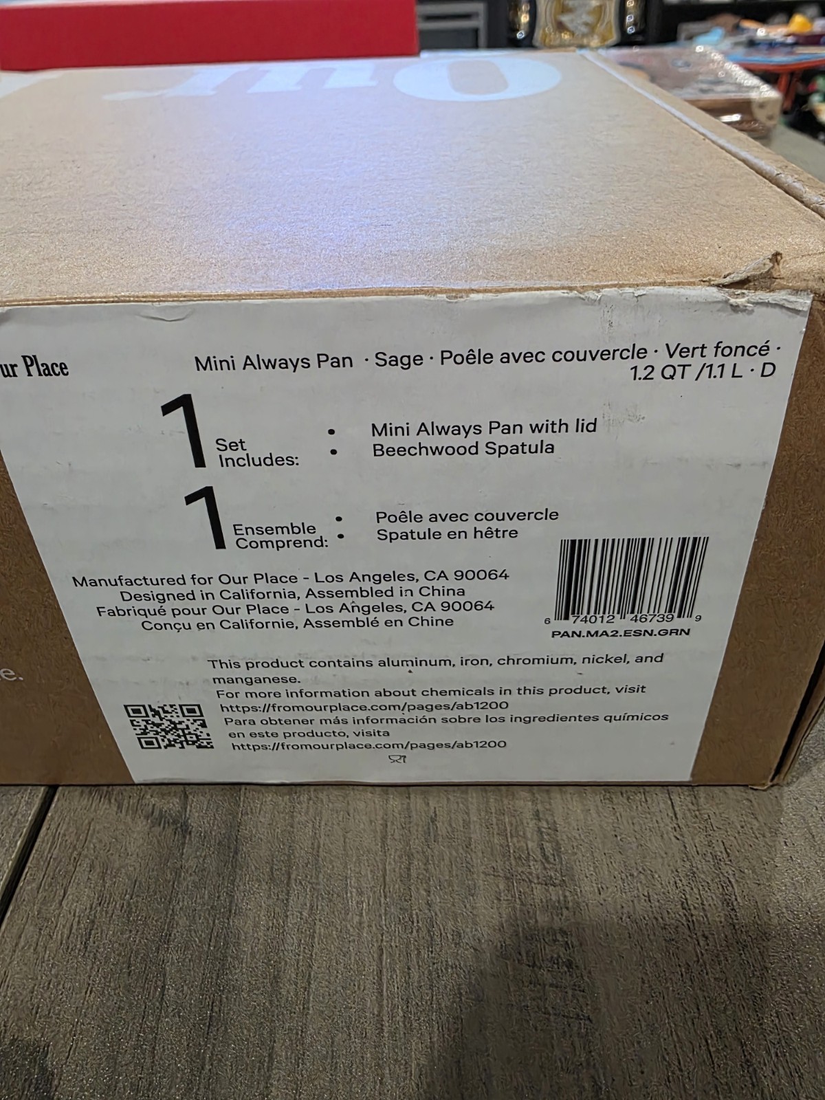 **Ships in its original box with shipping label attached. Not blind.*** New/Open Box. This Our Place Mini Always Pan is a versatile and durable frying pan made of high-quality ceramic material. The non-stick surface of the pan makes cooking and cleaning a breeze. It is suitable for induction and electric stoves and ovens, and comes in a beautiful sage color. The pan has a capacity of 1.2 quarts and is a great addition to any kitchen.
