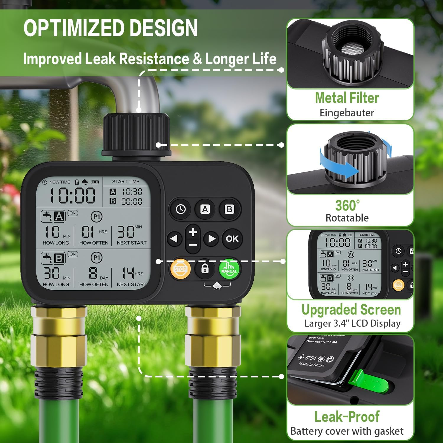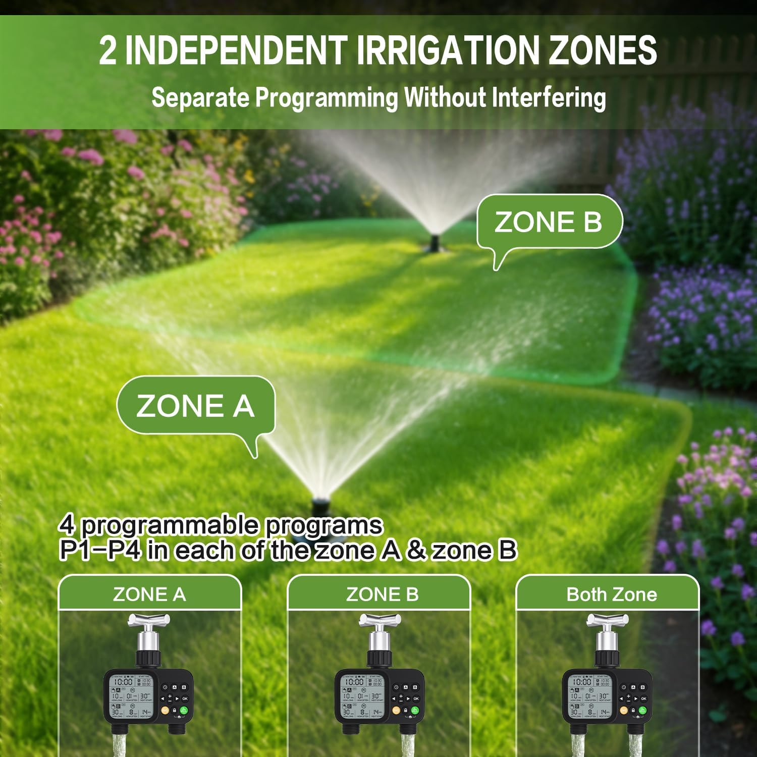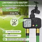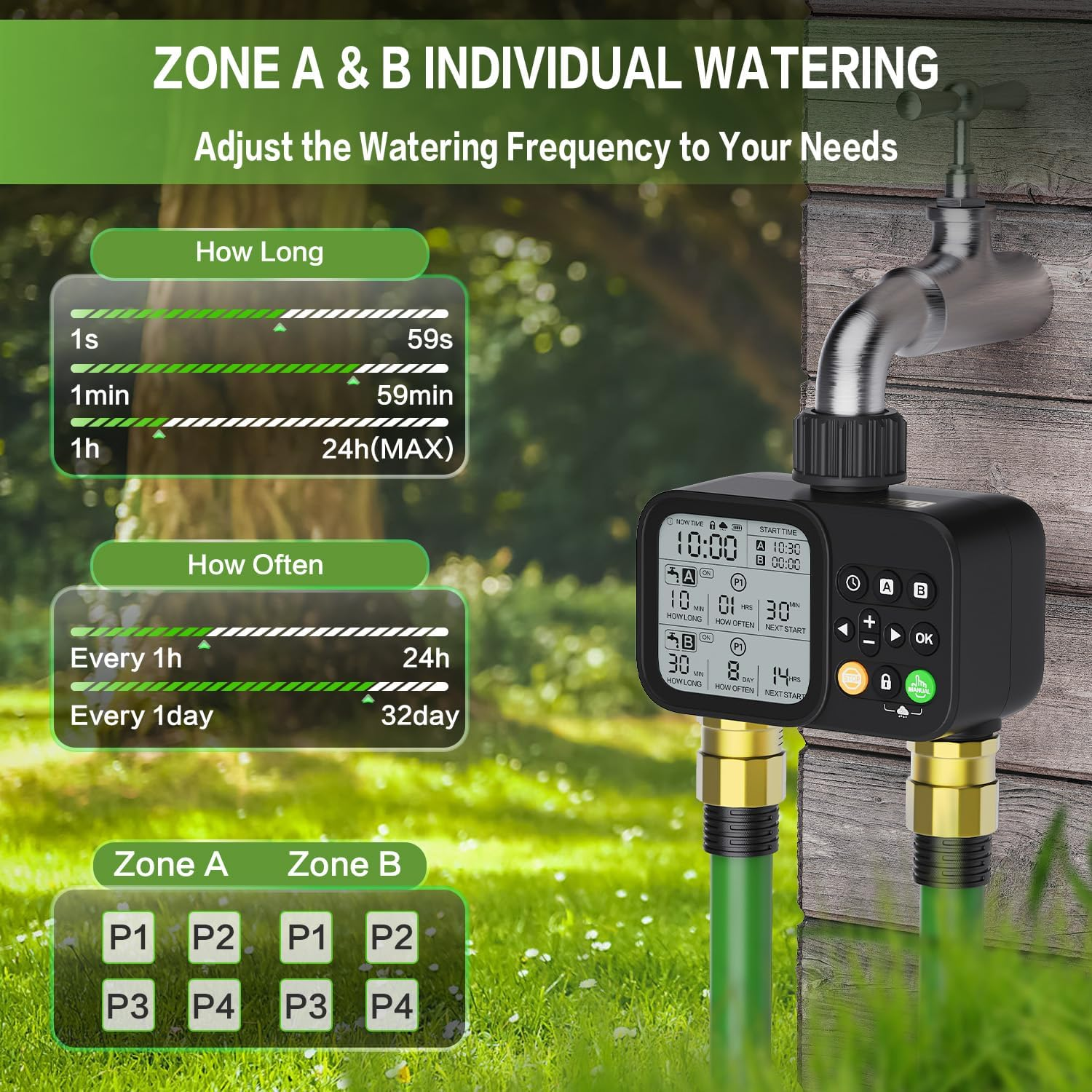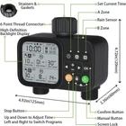 【 2 Zone Customized Watering Control 】 The 2 independent channels of the sprinkler timer allow you to program the program easily. You can set the start time, watering duration from 1 second to 24 hours, and watering frequency from 1 hour to 24 hours or daily to every 32 days. The ultra-wide range of time settings allows you to more accurately customize the watering schedule for each zone. 2 zones with a total of 8 programs gives you the flexibility you need to meet your watering needs. 【 3 Manual Modes + Smart Rain Delay 】 The Timer has 3 manual modes that can be switched using the “Zone” button. You can easily set the desired length of manual watering(1sec-24h) and water quickly whenever you want, this flexibility is perfect for watering an area a little more. The water hose timer has a rain-sensing chip on top, you can skip this scheduled watering on a rainy day, it won't interrupt your schedule and retains your preset irrigation program, which can avoid wasting water. 【 Ultra-Clear LCD & Child-Safe Design 】 The hose timer with a large LCD display that shows watering time, watering frequency and other details, allowing you to check the readings more easily. The child lock mode keeps the garden hose timer safe from children's activities and avoids misuse, a great feature for outdoor use. In addition, if the battery needs to be replaced, the indicator light will flash as a warning and the low battery valve will automatically shut off to avoid wasting water. 【 Heavy-Duty Leakproof Construction 】 Our automatic irrigation watering timer has a leak-proof design. The connector is made of 30% reinforced nylon material that can withstand water pressure up to 116psi, a built-in stainless steel filter to filter out debris, and a sealing gasket to prevent leaks. The battery cover has a sealed rubber ring and a battery cover latch to ensure greater security. The garden hose timer is IP54 waterproof and has a roll of thread-sealing tape to prevent leaks. 【 Universal Outdoor Irrigation Solution 】 Automatic watering system is suitable for use in a variety of scenarios, it can be used in a garden, lawn, yard, shrubs, vegetable garden, patio, etc., which can meet your daily life needs for a sprinkler controller. The garden watering timer is also suitable for outdoor gravity drip irrigation systems, garden irrigation watering, and so on. Package includes: water timer*1, thread sealing tape*1, nipple connector*2, manual*1. Product Description 1 Timed Watering 2 Manual Watering 3 Rain Delay 4 Low Power OFF 1 8 Programs 2 Package 3 Large Display